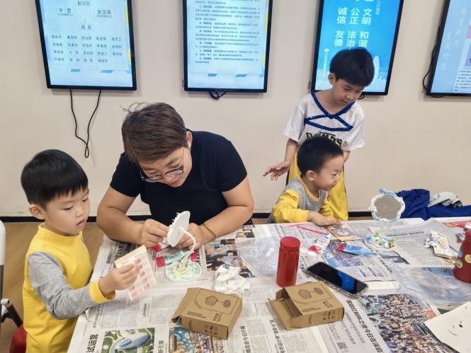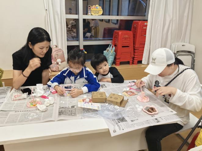 随着手工活动的开展,现场迅速化为一片温馨而热烈的创作工坊。在专业手工老师的指导下,各组家庭领取镜面、奶油胶与丰富配件投入制作。孩子们化身“创意设计师”,父母则成为“最佳搭档”,从挤胶、勾勒到点缀装饰,每一个步骤都考验着亲子间的配合与耐心。