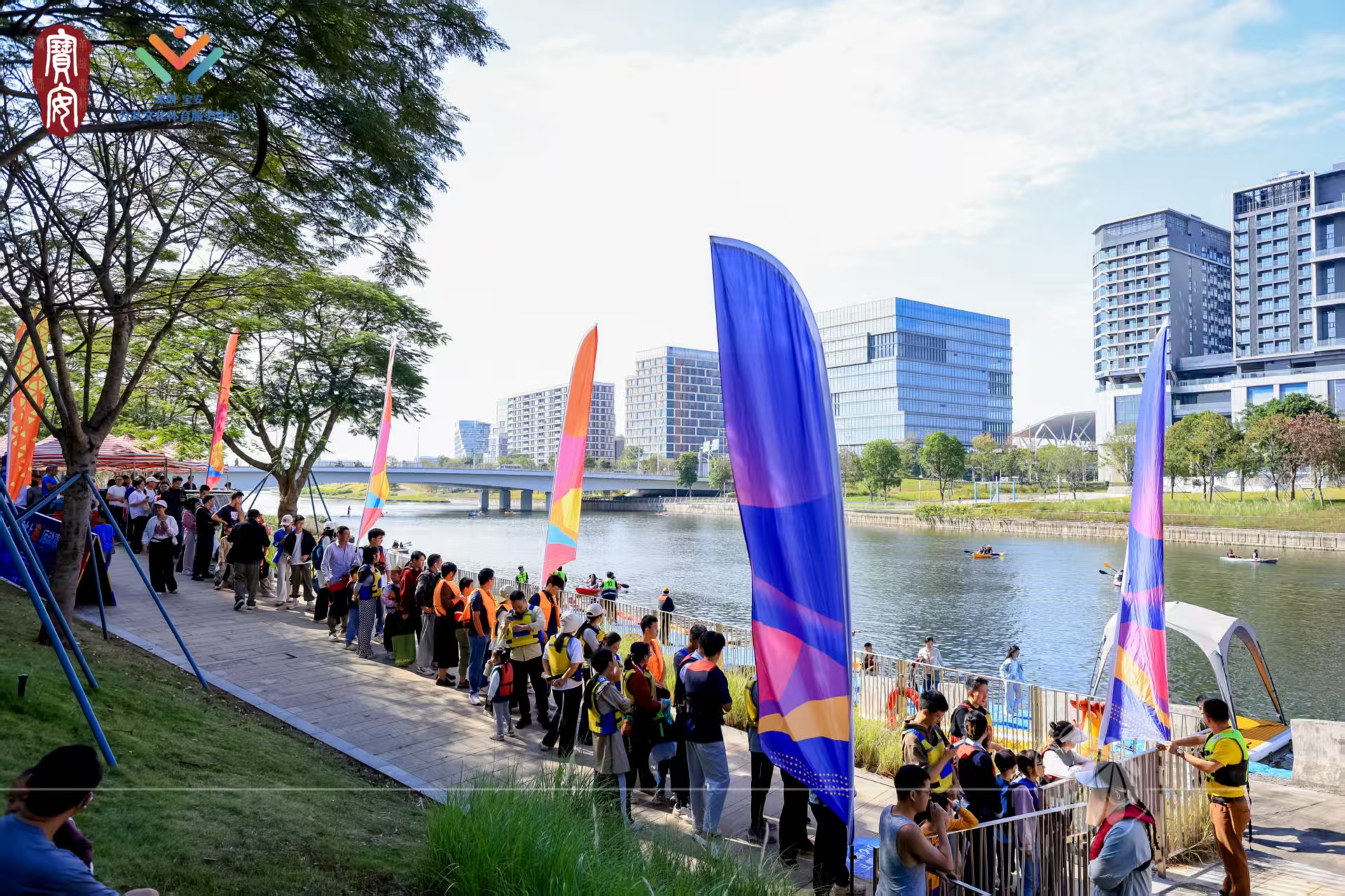 嘉年華緊扣“魅力灣區、動感鵬城、活力灣畔”主題,聯動十五運會體育競技精神與高交會創新展示氛圍,深度融合福海河生態資源與體育文旅元素,設置了多項兼具參與性與觀賞性的特色內容,吸引市民及國際友人踴躍參與。活動期間每日9:00至17:00開放(12:00至14:00器材維護),工作人員全程提供雙語服務,市民與國際友人可掃描現場活動二維碼,免費參與水上皮划艇、水上龍舟、水上露營、槳板挑戰、水上帆船、水上拔河等6大趣味水上項目。其中擁有200多年歷史、被譽為“水上高爾夫”的現代賽艇體驗,讓中外參與者近距離感受百年運動的獨特魅力,踐行十五運會“全民健身體育惠民”理念。同時,水上露營專區配備帳篷、露營椅等設施,為市民提供休憩觀景的愜意空間;現場同步設置人偶互動、小丑氣球表演、沿途打卡牆等趣味環節,搭配清晰的指引標識系統,全方位提升市民及國際友人參與體驗。