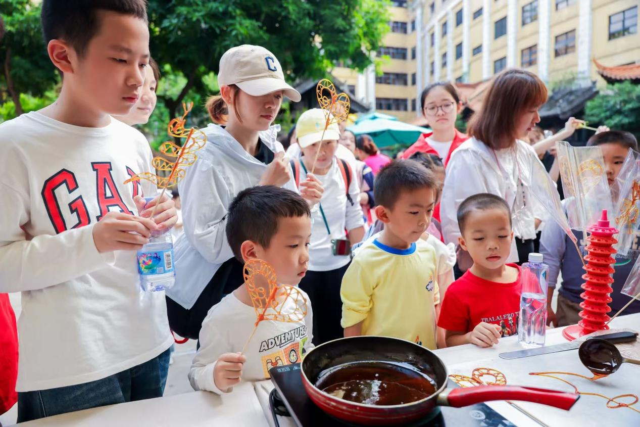 “岭南草编”摊位上,民间草编艺人现场创作,用棕榈叶编出十二生肖、蛟龙等栩栩如生的作品,引得市民驻足围观;“绳编中国结”摊位前,孩子们亲手编织着满载祝福的中国结;“非遗皮雕”摊位前,工艺美术大师现场秀出精彩皮雕工艺,尽显“软浮雕”魅力;古法糖画摊位前排起长队,师傅手握长勺,以金黄糖液为笔、青石板为纸,“笔走龙蛇”间,龙、凤、兔子等造型跃然眼前,刚完成就被孩子们“抢”着领走。“以前觉得非遗离我们很远,今天能亲手体验,发现非遗真的太有魅力了!”打卡完多个摊位的大学生小王意犹未尽地感慨。