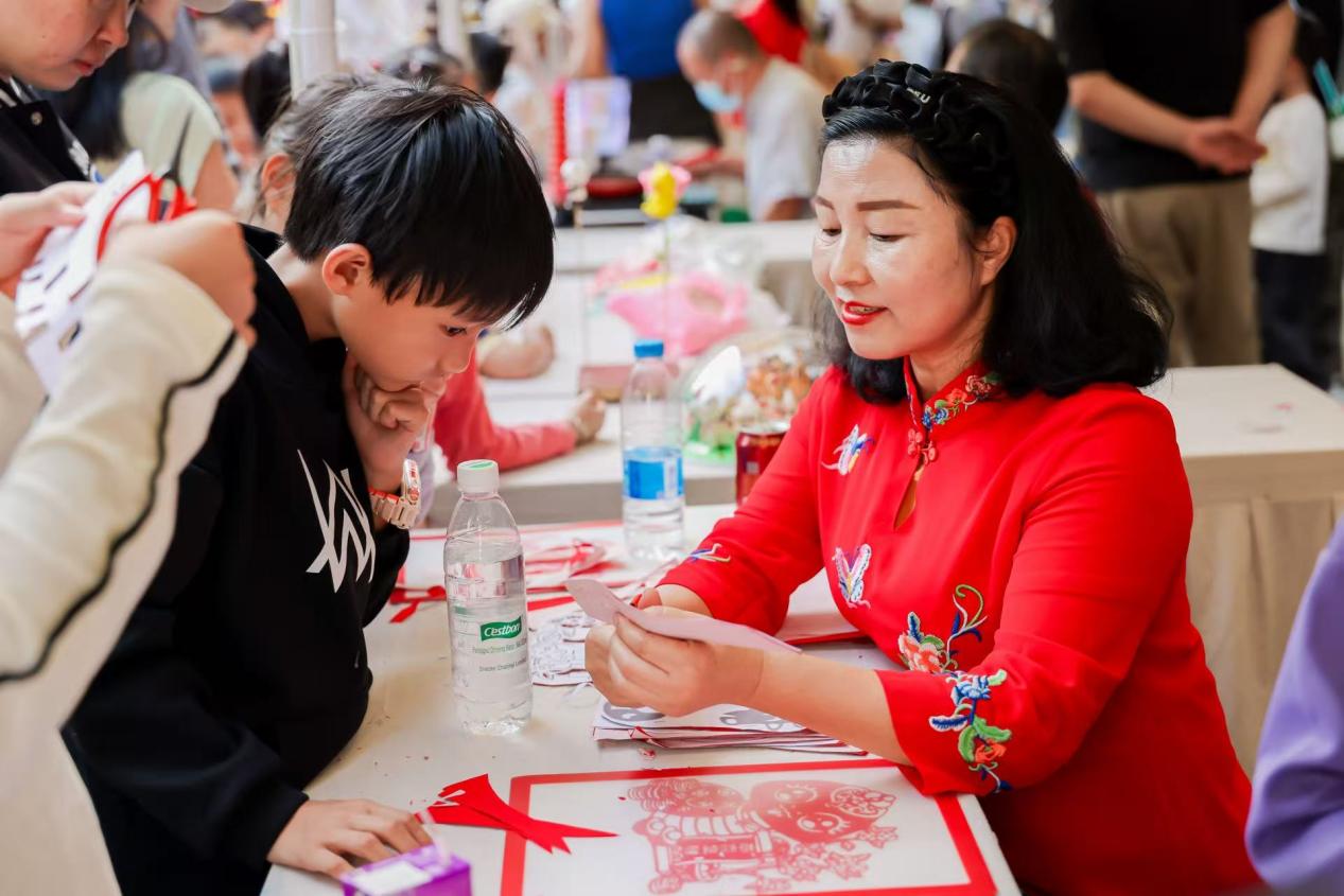 “多彩剪纸”摊位前,孩子们围成一圈,跟着非遗传承人学习剪纸技艺。剪刀在她手中翻飞,短短几分钟,寓意吉祥的福字、灵动的生肖纹样便跃然纸上,在摊主的手把手教学下,不一会儿,小朋友们手里的红纸就也变成了一个个漂亮的剪纸作品。