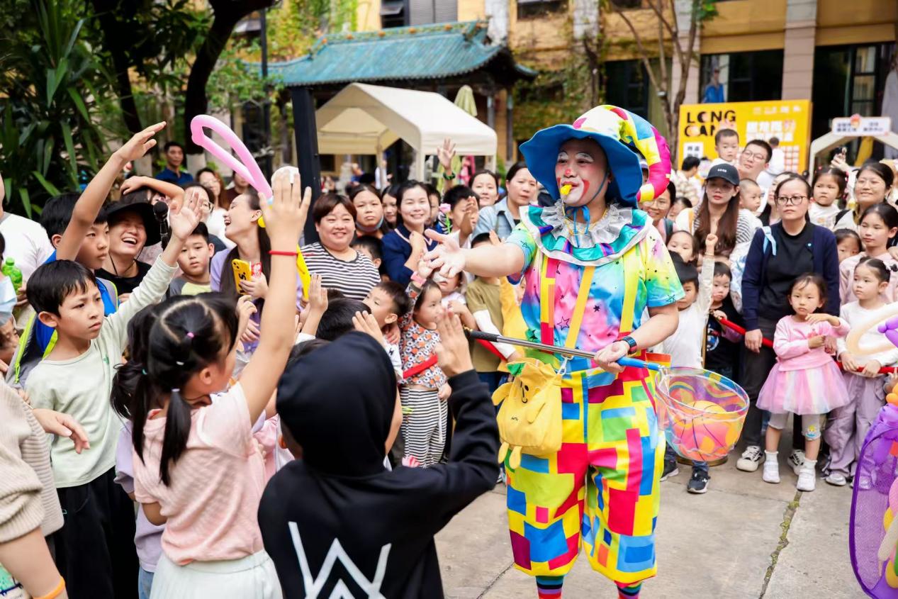 小丑叔叔则化身“快乐制造机”,只见他仿佛会魔法一般用气球捏出花朵、蝴蝶、小蜜蜂等可爱造型,还邀请观众玩起互动游戏,大人小孩围在舞台边争相参与,连连欢呼。