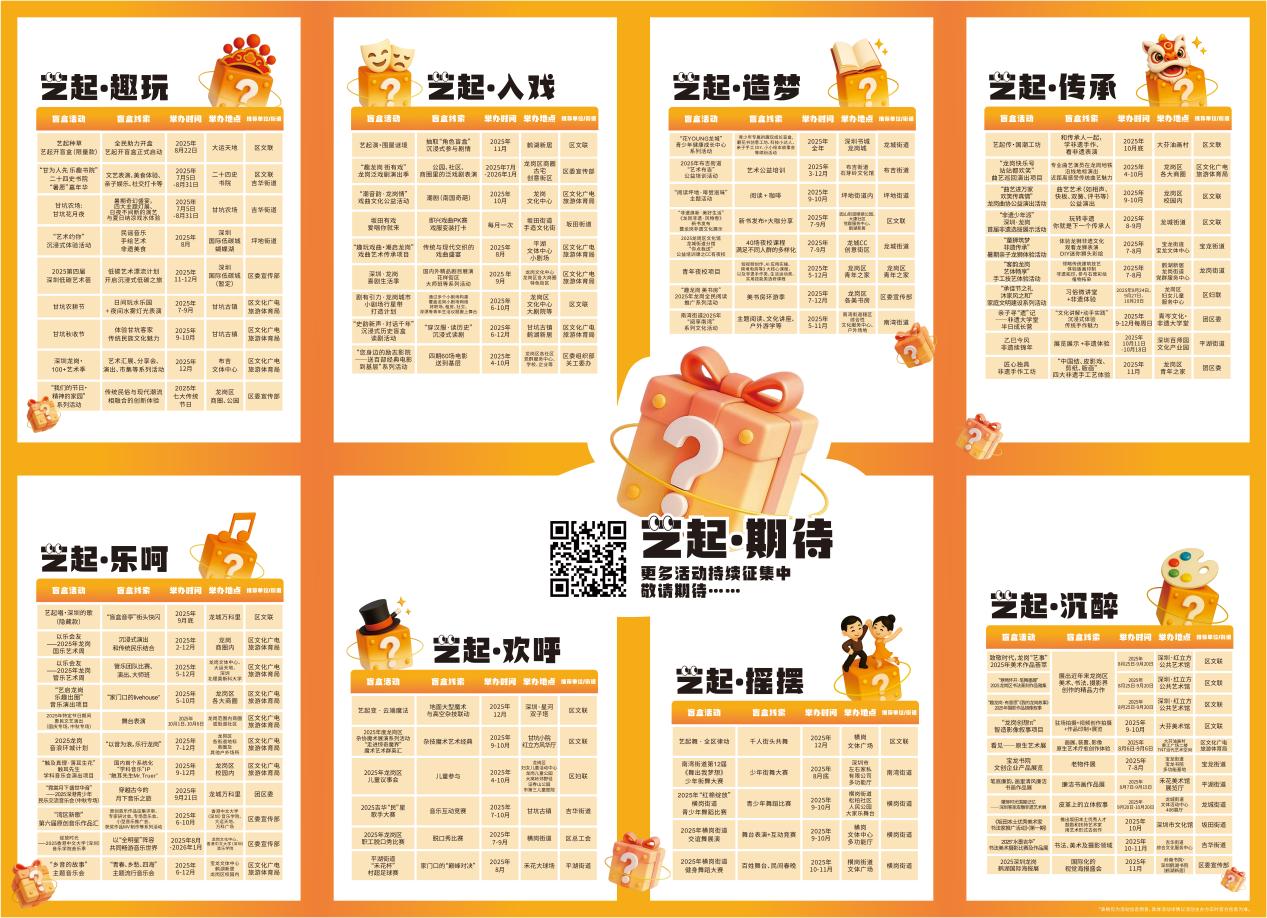 活动现场,不少市民在“寻宝指南”领取处驻足。“龙岗艺术盲盒地图”清晰标注出全区文化枢纽、文化新空间、文化微场景,扫码即可查看详细介绍;“艺起开盲盒”活动清单中,全年百余项惠民文化活动一目了然。市民赵先生拿着地图规划起来:“下一场‘艺起演・围屋谜境’沉浸式戏剧,一定要再带孩子去体验!”