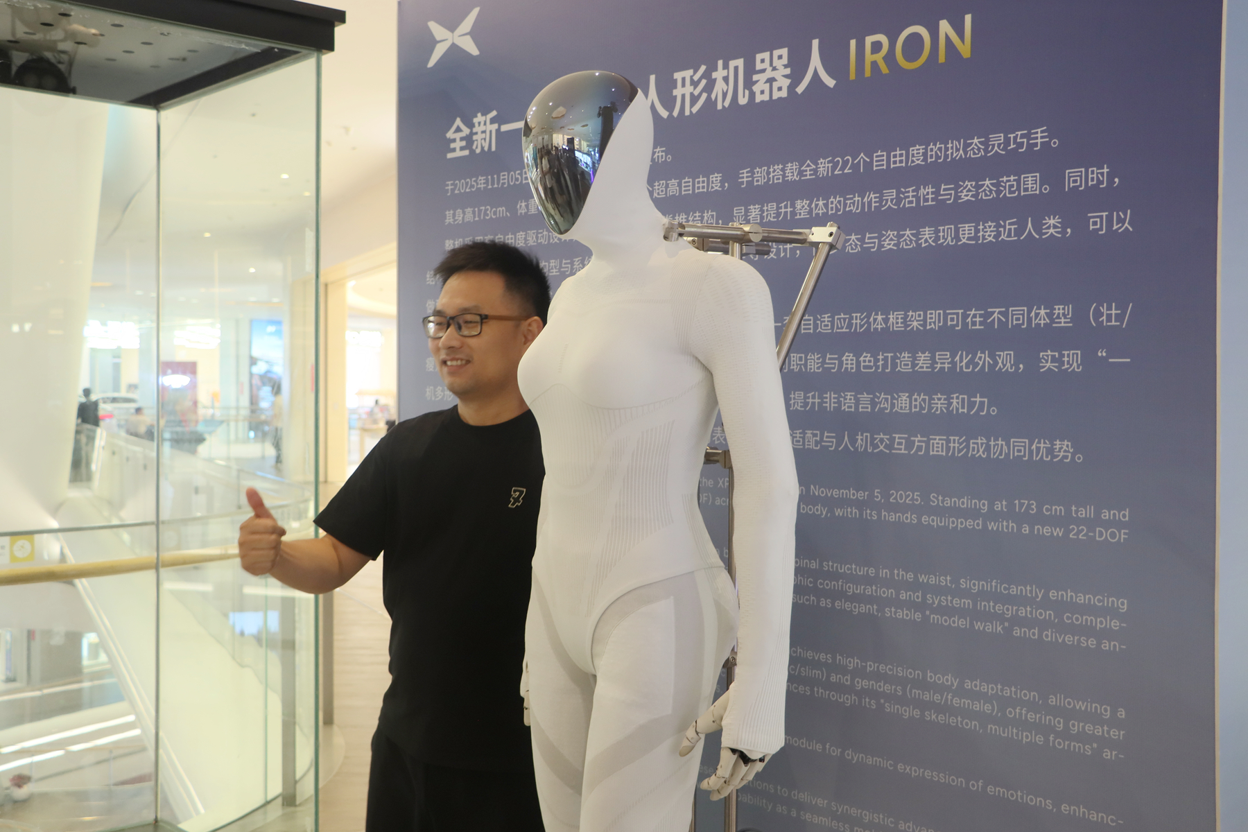 据悉,IRON机器人身高173厘米,体重65公斤,以其高度拟人的形态和灵活的运动能力为核心亮点。它全身拥有82个超高自由度关节,尤其是配备了22个自由度的拟人灵巧手,能够完成精细的抓取和操作任务。此次在深业上城商场L2层西侧中岛区域的展示,吸引了大量科技爱好者、市民及行业人士驻足观看。
