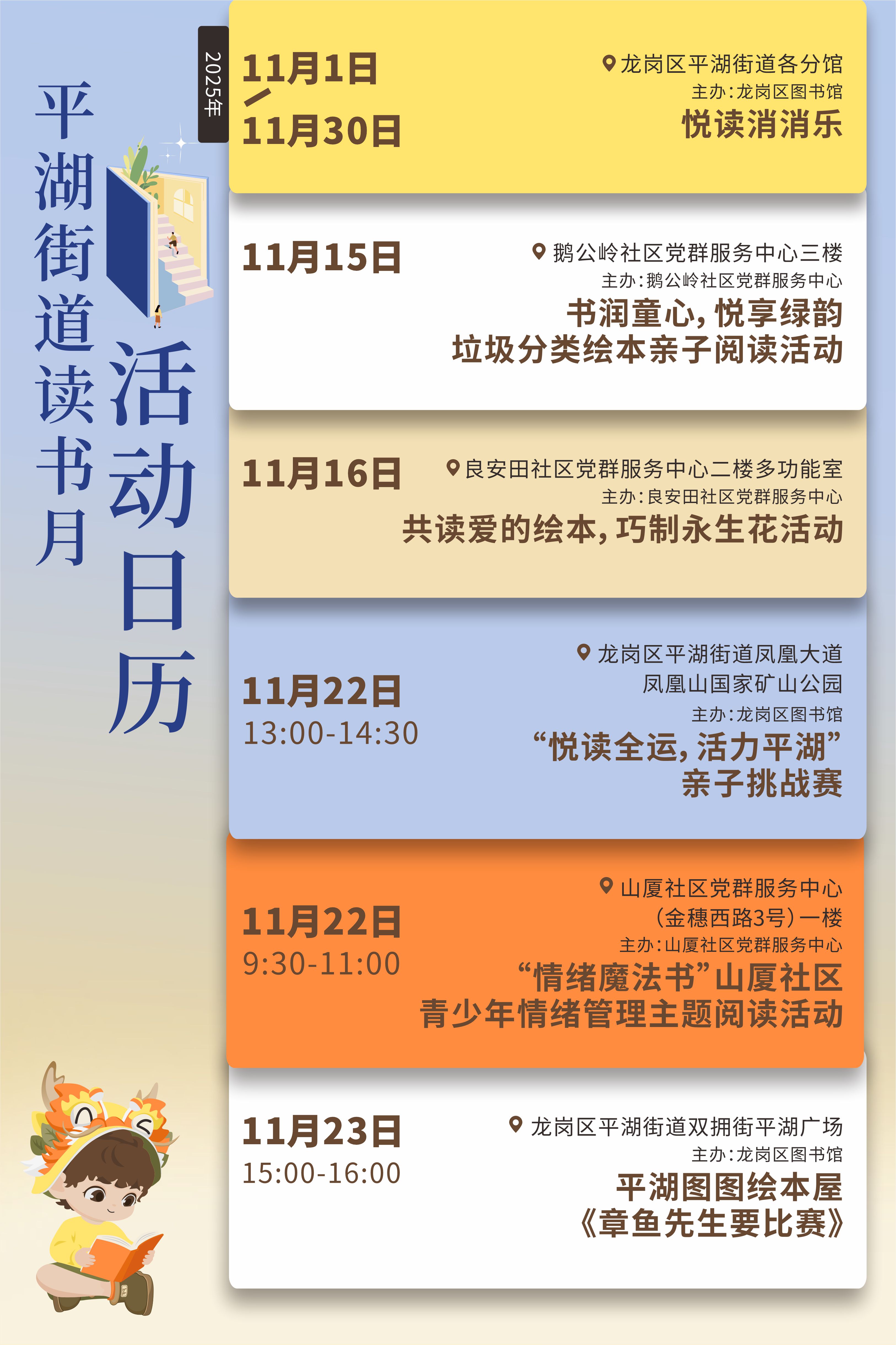 华南“愈”书房的揭幕,只是平湖街道读书月系列活动的一个缩影。这个11月,平湖的各个角落都将被书香环绕,不同年龄段的市民都能找到属于自己的阅读乐趣。幼儿园的小朋友可以参与“悦读消消乐”趣味打卡,在游戏中爱上阅读;亲子家庭能一起走进社区党群服务中心,共读垃圾分类绘本、制作永生花,在互动中增进感情;青少年可参加“情绪魔法书”活动,在书香中学会管理情绪;就连运动爱好者,也能在“悦读全运,活力平湖”亲子挑战赛中,感受阅读与运动结合的独特魅力。