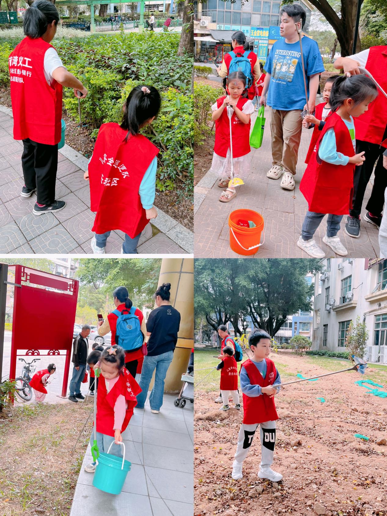 随后,在社区党员志愿者与社工带领下,亲子家庭分组化身“环保小卫士”,手持工具深入社区绿化带、健身区,细致清理烟头、塑料瓶等杂物。党员志愿者与社工全程示范引导,家长与孩子默契配合分类垃圾,红色党徽、妇联工作人员与亲子身影相映成趣,成为社区里践行儿童友好、守护生态环境的亮丽风景线。一小时集中清理后,社区环境焕然一新,孩子在实践中体会到责任与担当。