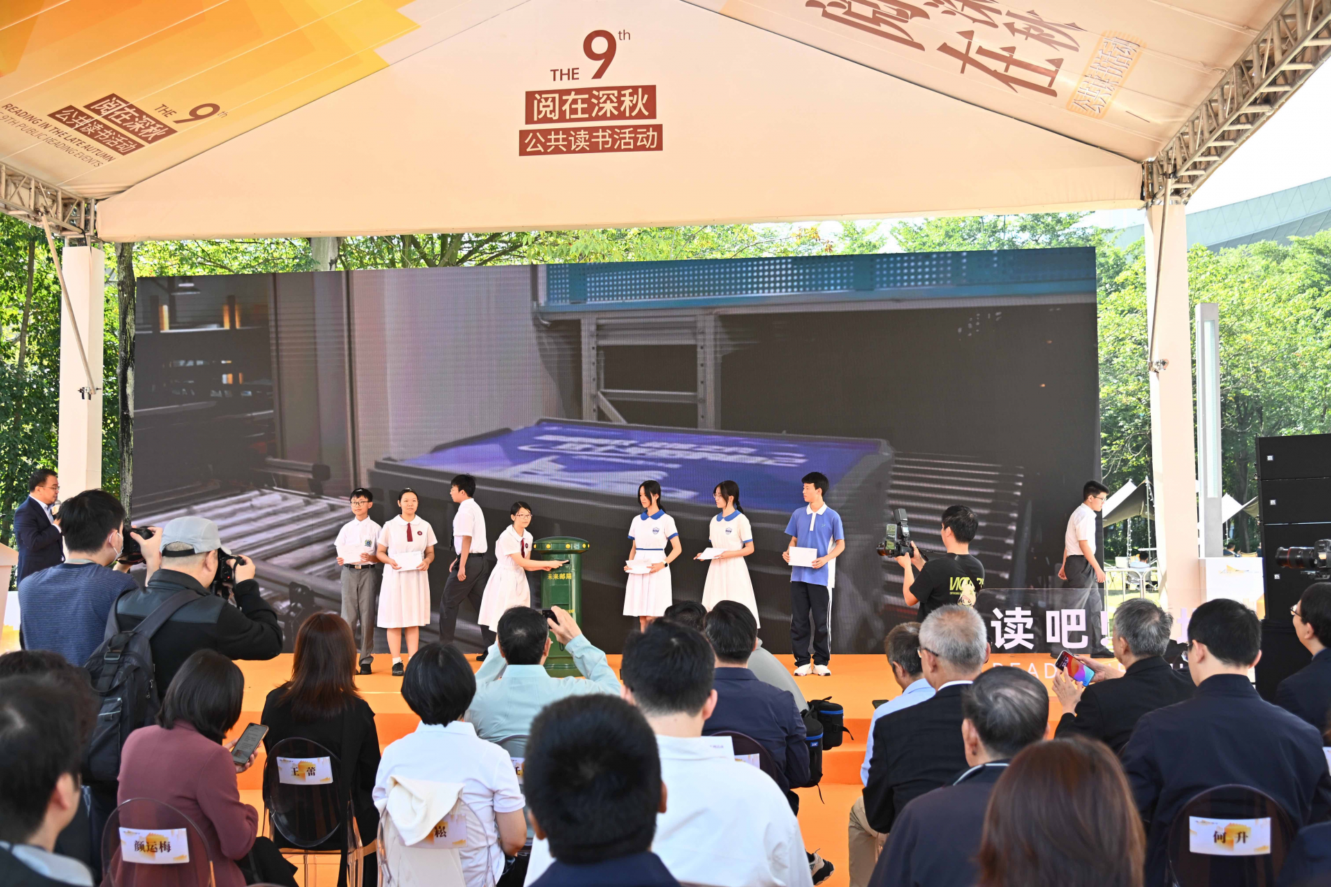 与会领导、嘉宾和读者代表共同见证“书香湾区·共阅未来”阅读推广系列活动揭幕,随后在深圳图书馆中心馆水幕广场观摩第九届“阅在深秋”公共读书活动,并入馆观看展览。