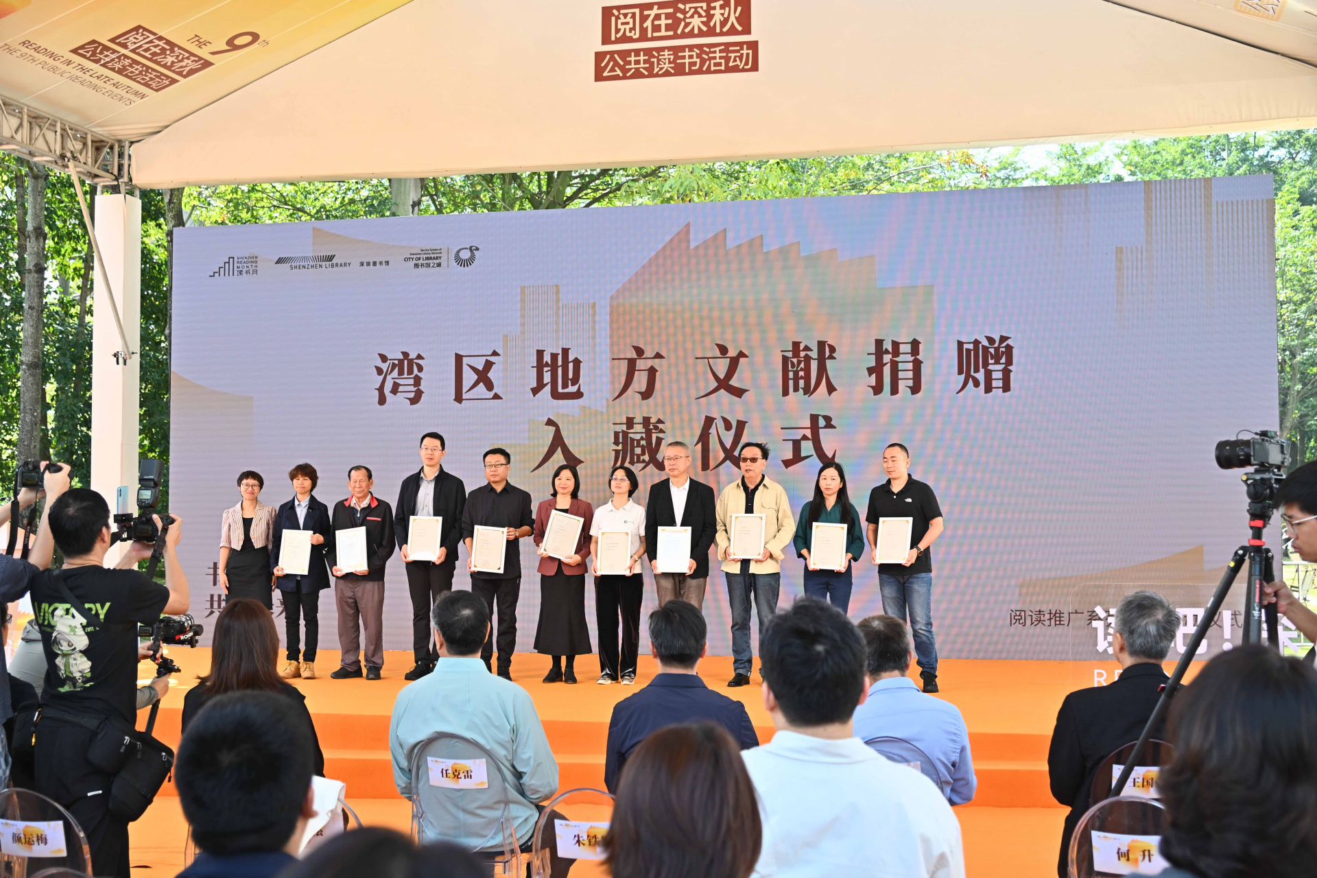 深圳图书馆作为城市文献资源保障中心,长期致力于搜集、整理、保存深圳地方文献,珍藏城市文化记忆,今年以来收到各方捐赠的地方文献181种,477册、件,更携手粤港澳大湾区各城市,守护、传承湾区文化。仪式现场举行了湾区地方文献捐赠仪式。广州大典研究中心、广东内伶仃福田国家级自然保护区管理局、《特区文学》杂志社、深圳市龙华区中国·观澜版画原创产业基地、深圳技术大学图书馆5家机构代表,以及原深圳市决咨委专家,深圳市绿色产业促进会、深圳市蓝色海洋保护协会创始人梁俊乾,深圳市长青诗社荣誉社长、深圳市诗词学会荣誉顾问黄重远,东江纵队后人杨杰燕,深圳·君阅籍古旧书店店主何君茹,堆石唱片机创始人张渊5位个人代表上台接受捐赠证书。
