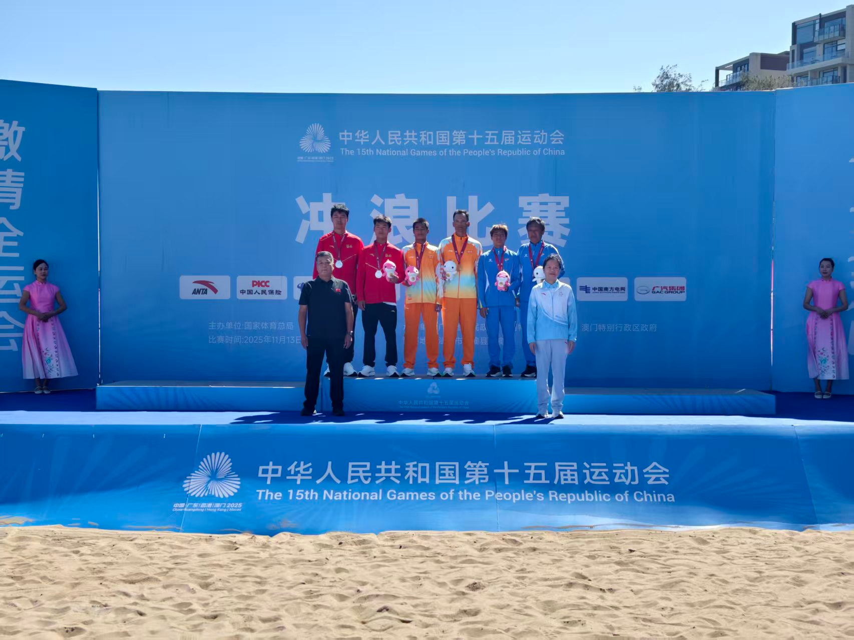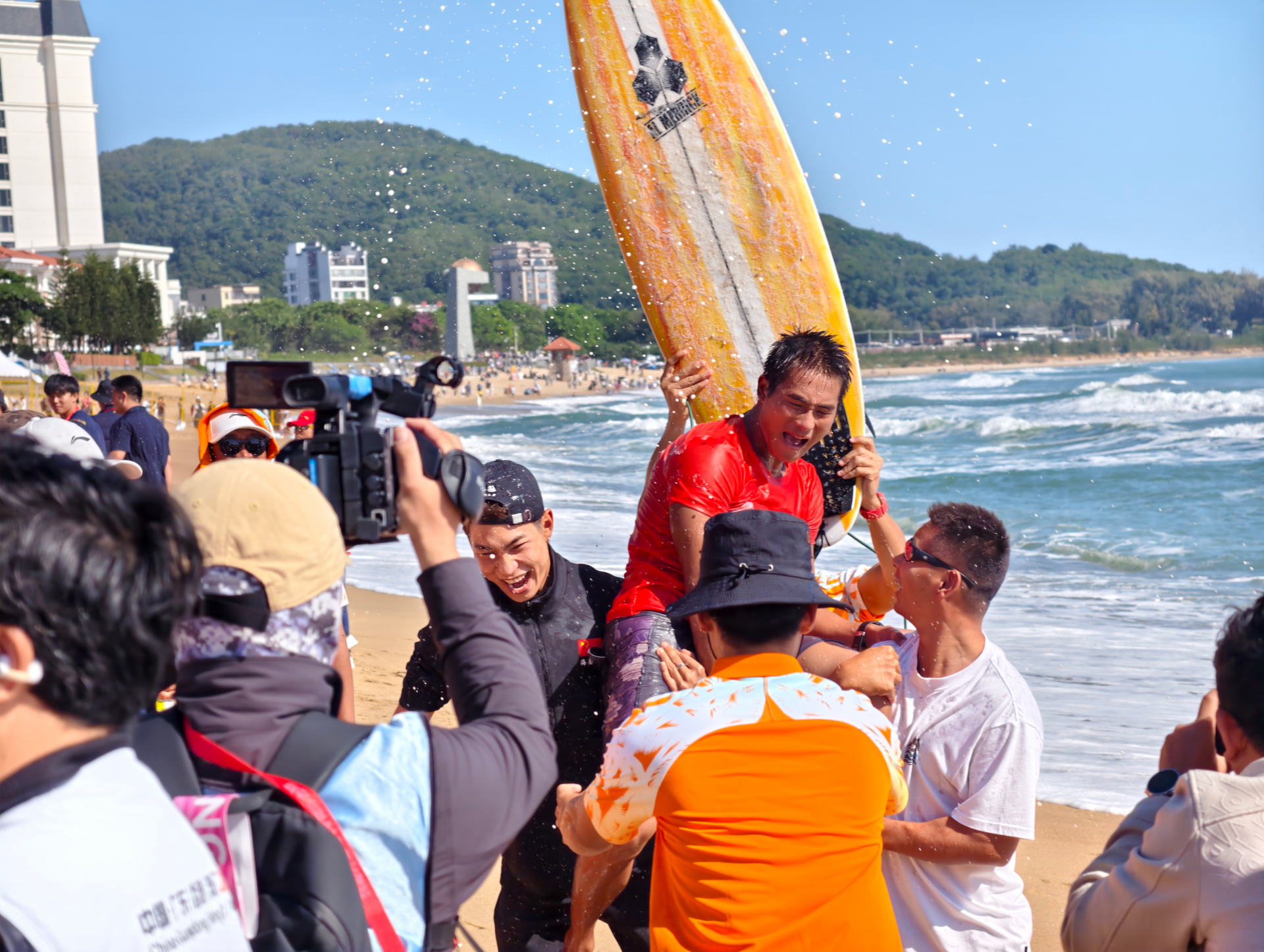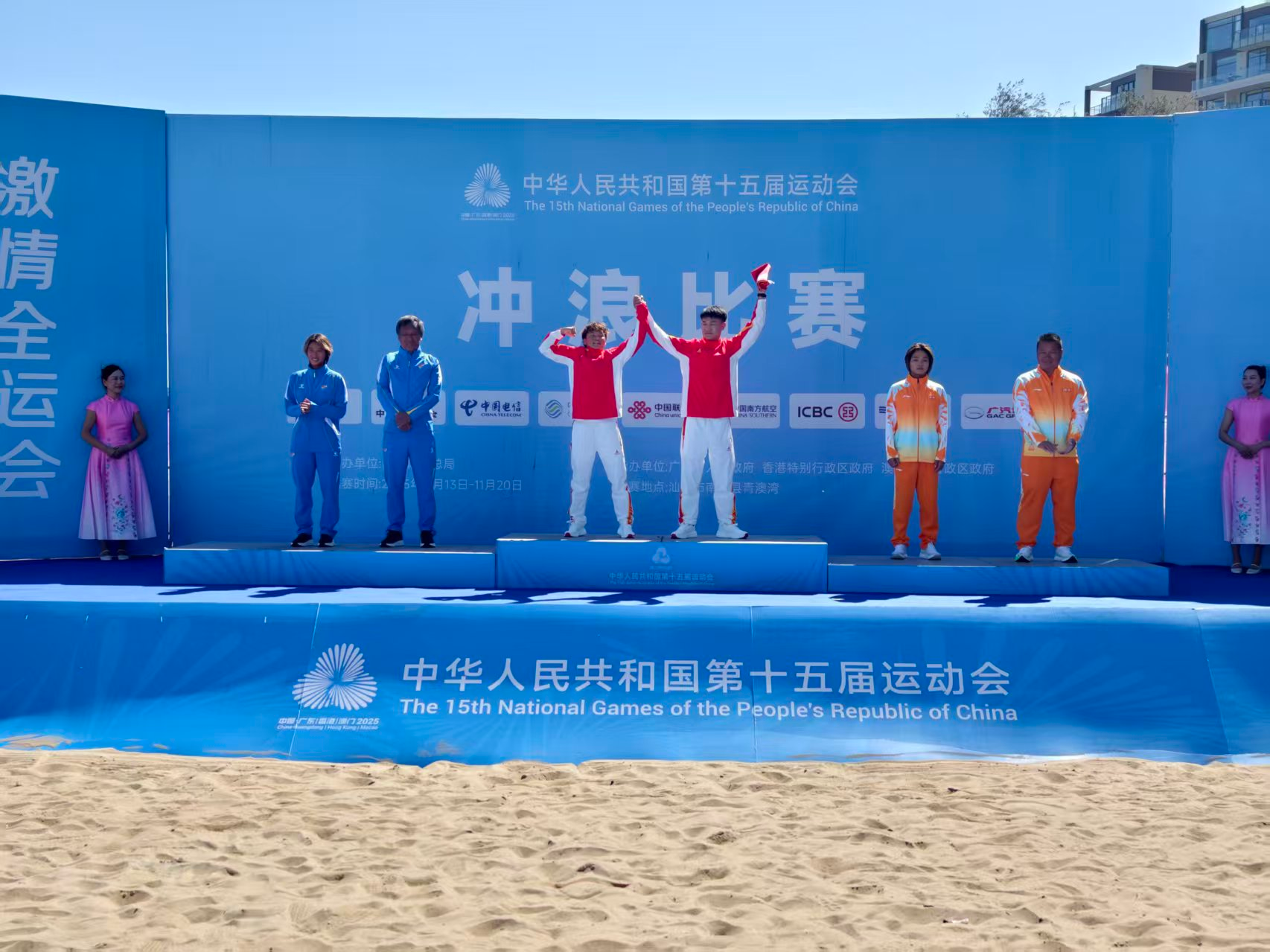 11月16日上午,第十五届全运会冲浪项目决赛在汕头青澳湾进行。在男子短板决赛中,海南选手吴世栋凭借高超的冲浪技术和稳定的临场表现,战胜河北选手董子豪夺冠,为海南代表团再添1枚金牌。