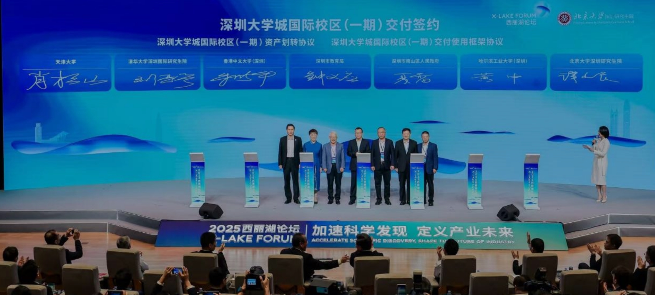 開幕式環節進行三大關鍵發布。一是國家知識產權局與北京大學共建的國際知識產權學院正式成立,該學院由北京大學國際法學院具體承建,作為落地在粵港澳大灣區的國際知識產權學院,其旨在打造集教育、科研、智庫和國際合作於一體的、具有國際影響力的知識產權人才培養高端平台,服務國家知識產權強國戰略和粵港澳大灣區高水平知識產權人才高地建設。二是北京大學科學智能學院“博雅AI4S拔尖人才計劃”本-碩-博貫通制項目正式啟動,該項目將通過“AI+Science”雙導師制培養既通曉AI原理又明晰細分科學領域的交叉複合型人才。三是深圳大學城國際校區(一期)交付簽約儀式同步舉行,五校攜手,共創未來,將進一步強化西麗湖區域在產學研協同與開放創新方面的集聚能級。