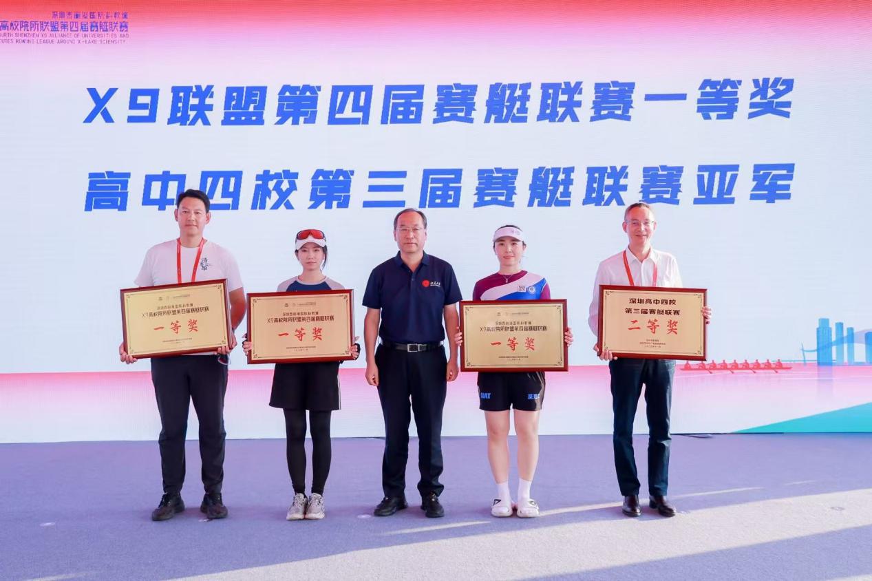 下午進行的300米競速決賽成為全場焦點,各隊賽艇在大沙河水面輕盈穿梭,於夕陽底下水波粼粼金色光景中,劃出一道道流暢而優美的弧線,引得現場觀眾掌聲雷動,氣氛熱烈非凡。經過多輪較量,各組別的冠軍隊伍脫穎而出。最終,根據三站總積分排名,北京大學深圳研究生院以總積分第一榮獲X9高校院所聯盟第四屆賽艇聯賽團體總冠軍。清華大學深圳國際研究生院、哈爾濱工業大學(深圳)、深圳理工大學-中國科學院先進技術研究院獲得一等獎,南方科技大學、深圳大學、香港中文大學(深圳)、鵬城實驗室獲得二等獎。深圳外國語學校、深圳高級中學、深圳中學分別獲得高中四校第三屆賽艇聯賽冠亞季軍。