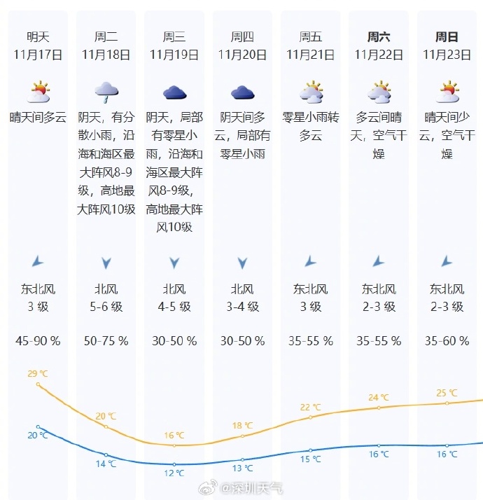 记者从深圳市气象台了解到,16日白天全市最高气温普遍达到28-29℃。预计17日白天有短时升温过程,17日夜间强冷空气抵达后,北风将加大,气温下降。具体预报为: