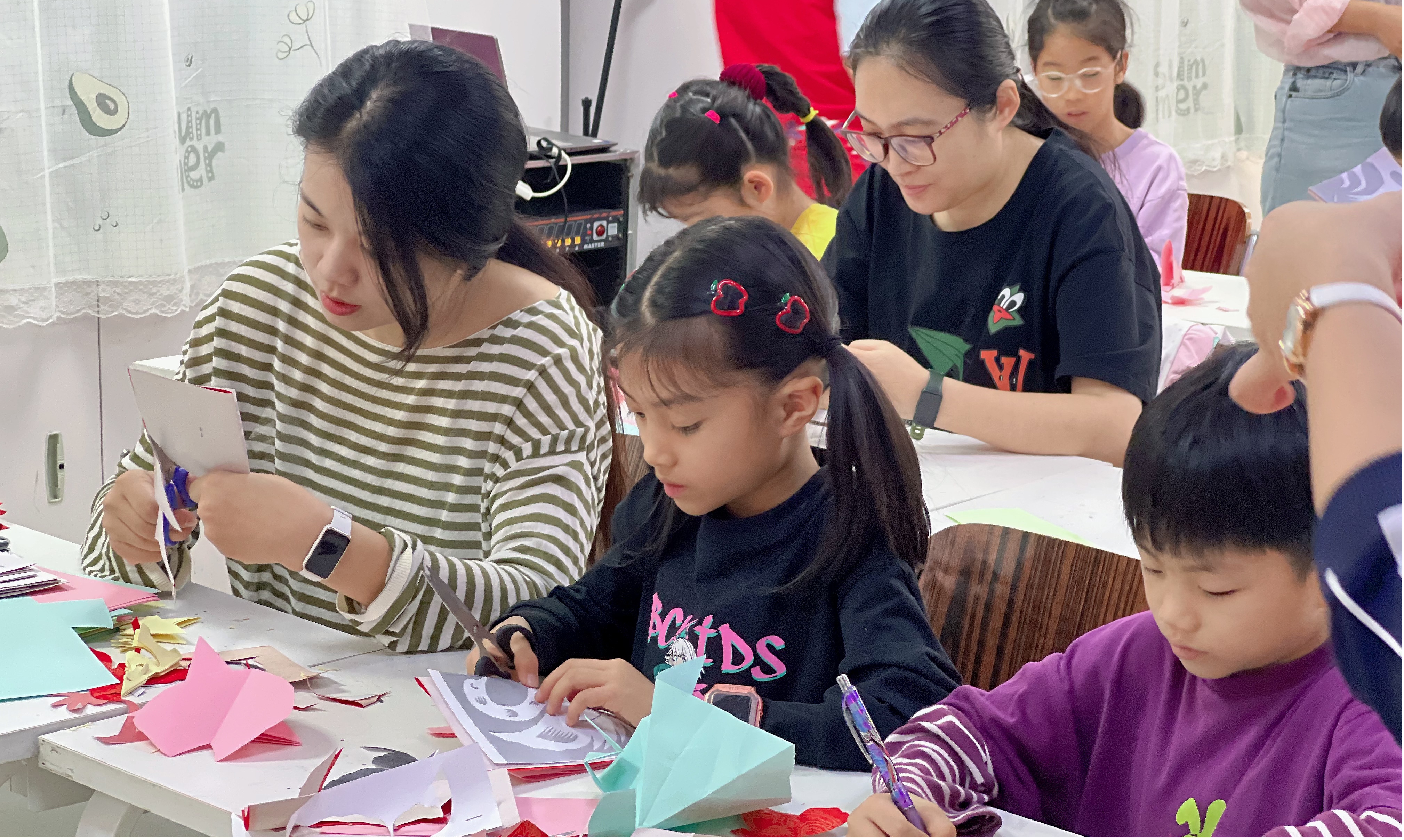 剪纸教学环节中,讲师细致拆解折纸手法、运剪力度等核心技巧,从基础窗花、萌趣小动物到对称纹样等进阶图案,层层递进引导创作。孩子们在家长的默契协助下,手持剪刀专注裁剪,红纸在指尖翻飞成一件件精致作品;家长们放下“指导者”身份,化身亲密伙伴,与孩子并肩创作、互帮互助,现场满是专注与温馨。