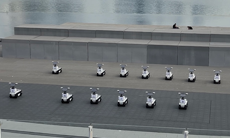 闭幕式总导演沈晨此前在媒体采访中曾预告,本次闭幕式的科技展演部分“会让大家大开眼界”,且是“独属于深圳”的亮点。记者在现场果然看到,整齐列队的具身智能自主导航移动机器人底盘,在海风中静静等候上场。