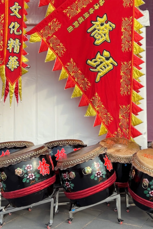▲彩排现场,福海桥头醒狮团的旗帜和大鼓