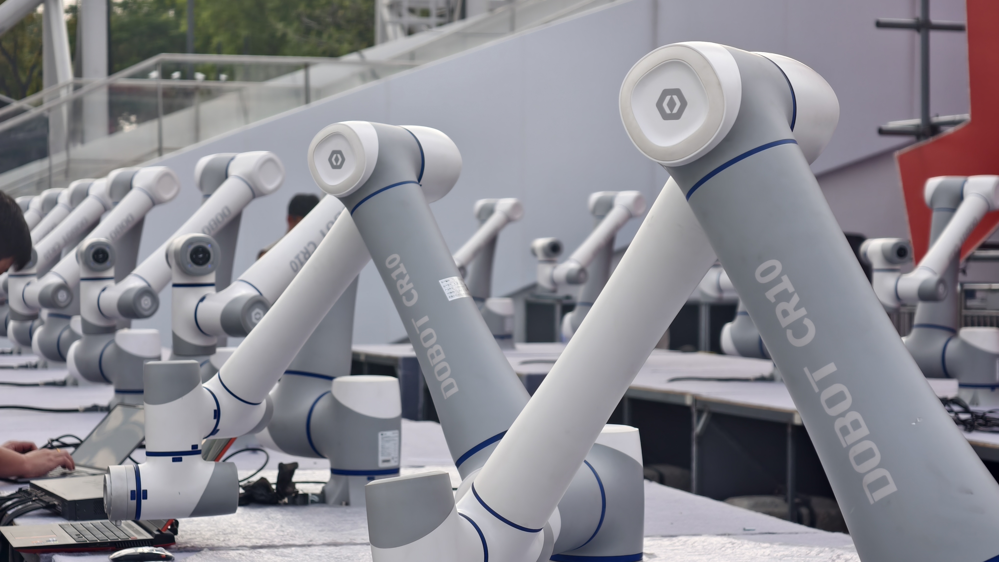 在台下,还有一批“演员”在候场,它们像人类手臂一样收成一致的角度,仿佛在积蓄力量。它们是来自深圳市越疆科技有限公司的CRA系列协作机器人。正在和同事进行调试的工作人员宋银波称:“我们这款产品主要是用于工业。它比较灵活,很多角度都可以到达,且稳定性高。”他还透露,这些机器人将在参演的节目中展现同步动作和类似舞蹈的流水动作。33台机械臂同时表演,是一次全新的尝试和突破。目前,工作人员主要对机器的两方面进行调试,一是保障每一个动作都卡在节拍上,二是确保机器在推动时的稳定性。