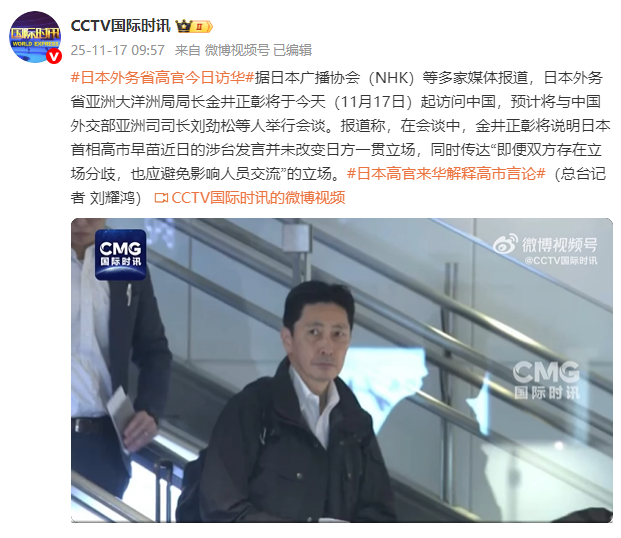 据日本广播协会(NHK)报道,日本外务省亚洲大洋洲局局长金井正彰将于今天(11月17日)起访问中国,预计将与中国外交部亚洲司司长刘劲松等人举行会谈。报道称,在会谈中,金井正彰将说明日本首相高市早苗近日的涉台发言并未改变日方一贯立场,同时传达“即便双方存在立场分歧,也应避免影响人员交流”的立场。