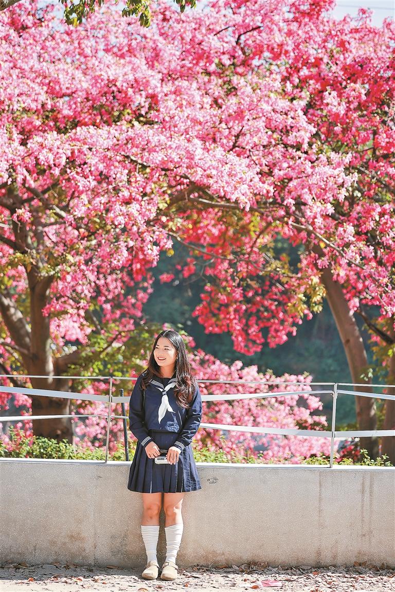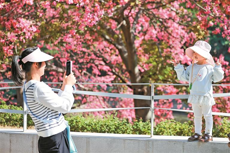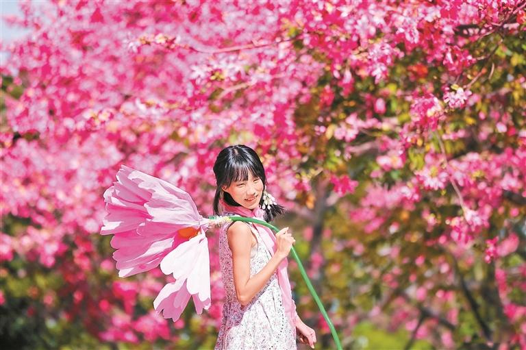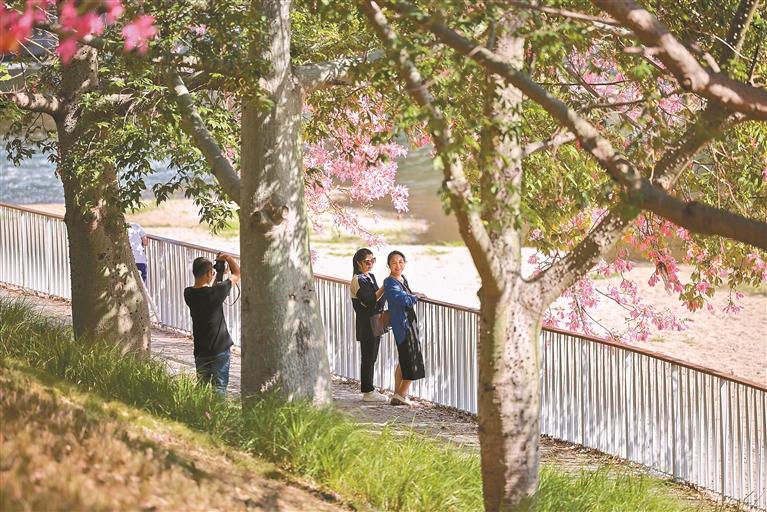 午后暖阳下,观澜河步道两侧的异木棉开得热烈奔放,粉色花瓣在微风中轻轻摇曳,偶尔飘落肩头,宛若置身童话世界。不少市民在花树下摆出各种姿势拍照打卡,手机快门声此起彼伏。“早就刷到这里的花海盛放,今天特意带家人来拍照,随手一拍都是大片!”市民李女士笑着说,她的朋友圈已被这片粉色浪漫刷屏。