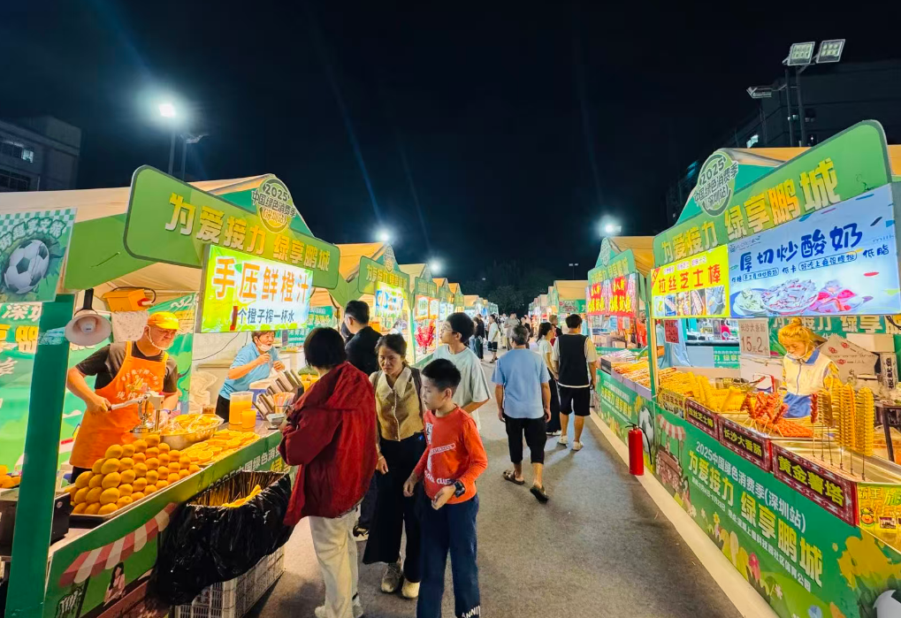赛事期间,绿色消费季上雪科技园社区体育公园主会场特别设置 “街超文旅互动区”,以 “跟着街超游深圳”为主题,通过图片、视频展示深圳街超赛事走过的代表性街区、商圈与景点,形成独特的“街超文旅地图”。来自大湾区的参赛选手与观赛球迷,在赛事之余走进绿色消费季现场,打卡“绿色地球”“动感足球”等主题灯光雕塑,在味觉体验与夜景沉浸中感受深圳的城市魅力。这种“体育赛事+文旅消费”的联动模式,既让街超赛事从单一体育活动升级为文旅融合的重要载体,也为绿色消费季注入了鲜活的体育动能。