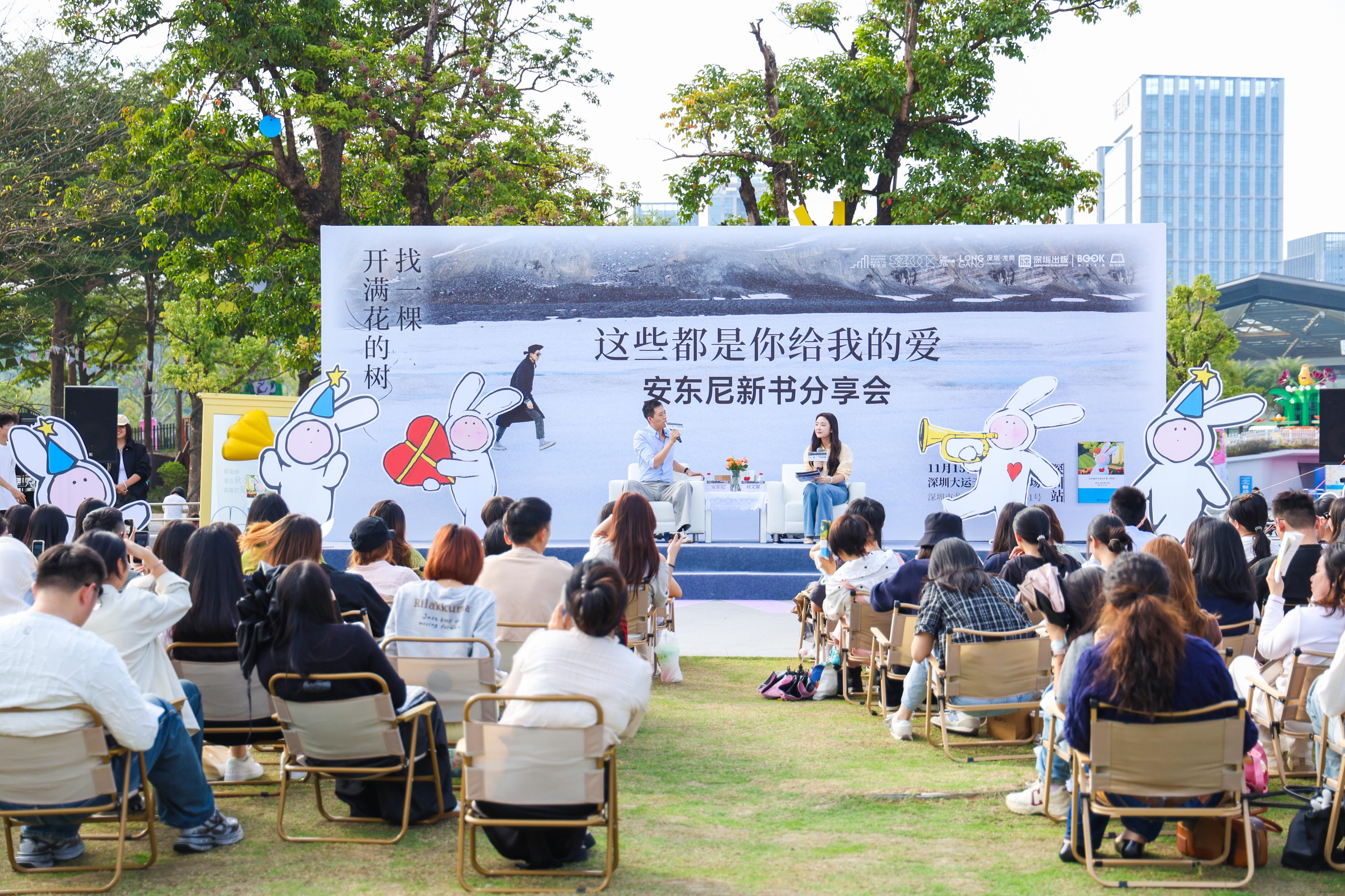 而在安东尼的“灵感客厅”里,素不相识的青年读者们因共同热爱围坐畅谈。蓝天绿茵花树作伴,灵感墙上各色便签连成一片,全是读者间“心有戚戚”的文字见证;大型萌物“不二兔”的合影景观处,萍水相逢的知音客相视而笑。当深圳读书月与龙岗“文学沉浸日”交汇,阅读从静默独处变成集体欢歌,年轻人们得以积攒表达的勇气,在别人的故事里找到自己的力量,并带着这份文学的馈赠,坚定地走向各自的人生旅程。