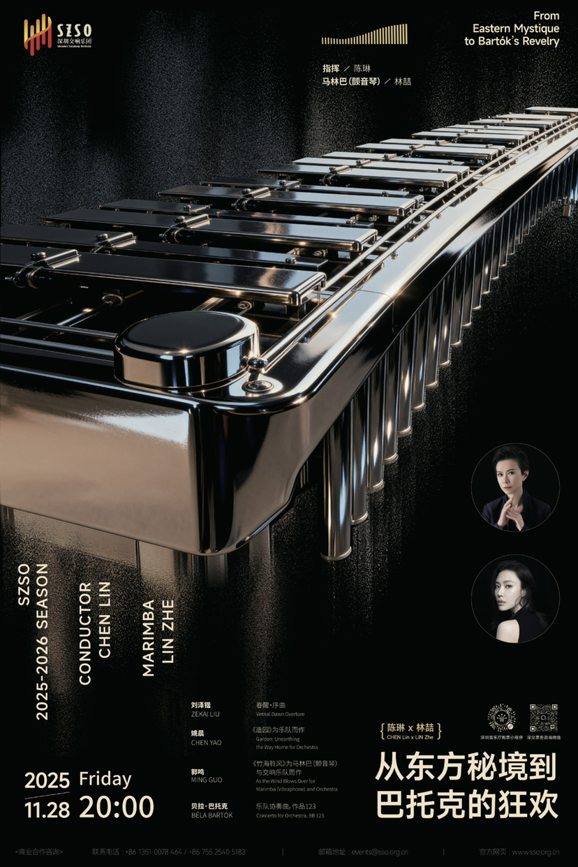 11月28日周五20:00,深圳交响乐团特邀指挥家、中央音乐学院指挥系主任陈琳执棒,将在深圳音乐厅举办“从东方秘境到巴托克的狂欢”交响音乐会,演奏当代青年作曲家刘泽锴的《春醒·序曲》、姚晨的《造园》、郭鸣为马林巴与交响乐队而作的《竹海聆风》(选自《多彩浙江》),以及巴托克色彩斑斓、气势恢宏的《乐队协奏曲》,引领听众穿行于中国当代作曲家的幽微意境与巴托克的交响世界之间,展开一场融合东西方音乐语汇的深度对话。