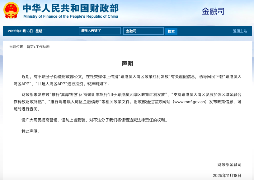 据财政部11月18日消息,近期,有不法分子伪造财政部公文,在社交媒体上传播“粤港澳大湾区政策红利发放”有关虚假信息,诱导网民下载“粤港澳大湾区APP”“共建大湾区APP”进行投资。