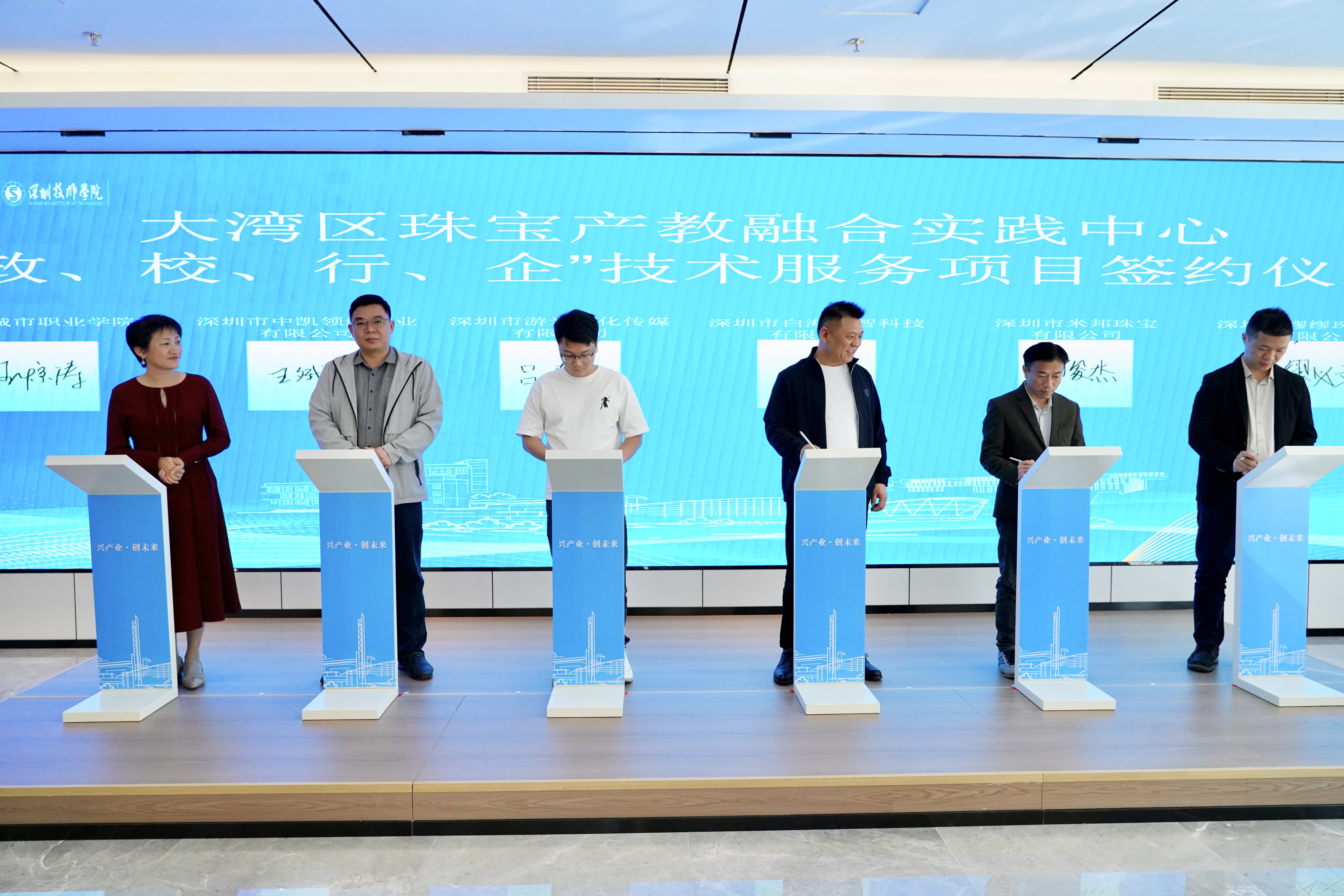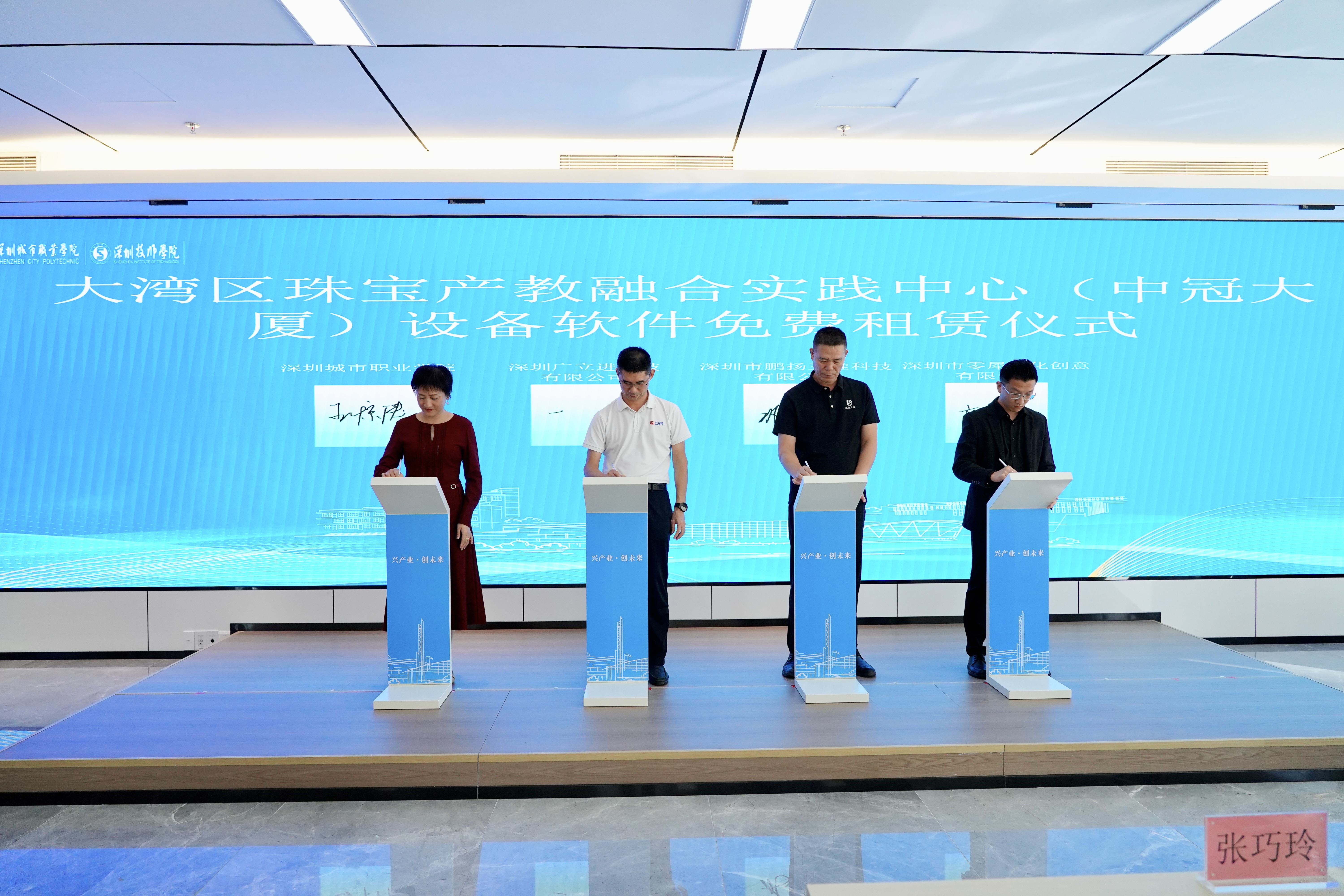 仪式核心环节,罗湖区相关职能部门、深圳城市职业学院、行业协会及甘露集团、周六福珠宝等企业代表共同为实践中心揭牌。随后,深圳城市职业学院珠宝学院先后与5家企业签约“珠宝加工智能制造夹具开发”“玉雕AI设计模型研发”等技术服务项目;与3家企业签订设备软件免费租赁协议,获赠微型七轴雕铣机、LCD首饰3D打印机及3D建模插件;同时与周六福珠宝签订“现代学徒制”校企合作协议,全方位深化产教融合实效。