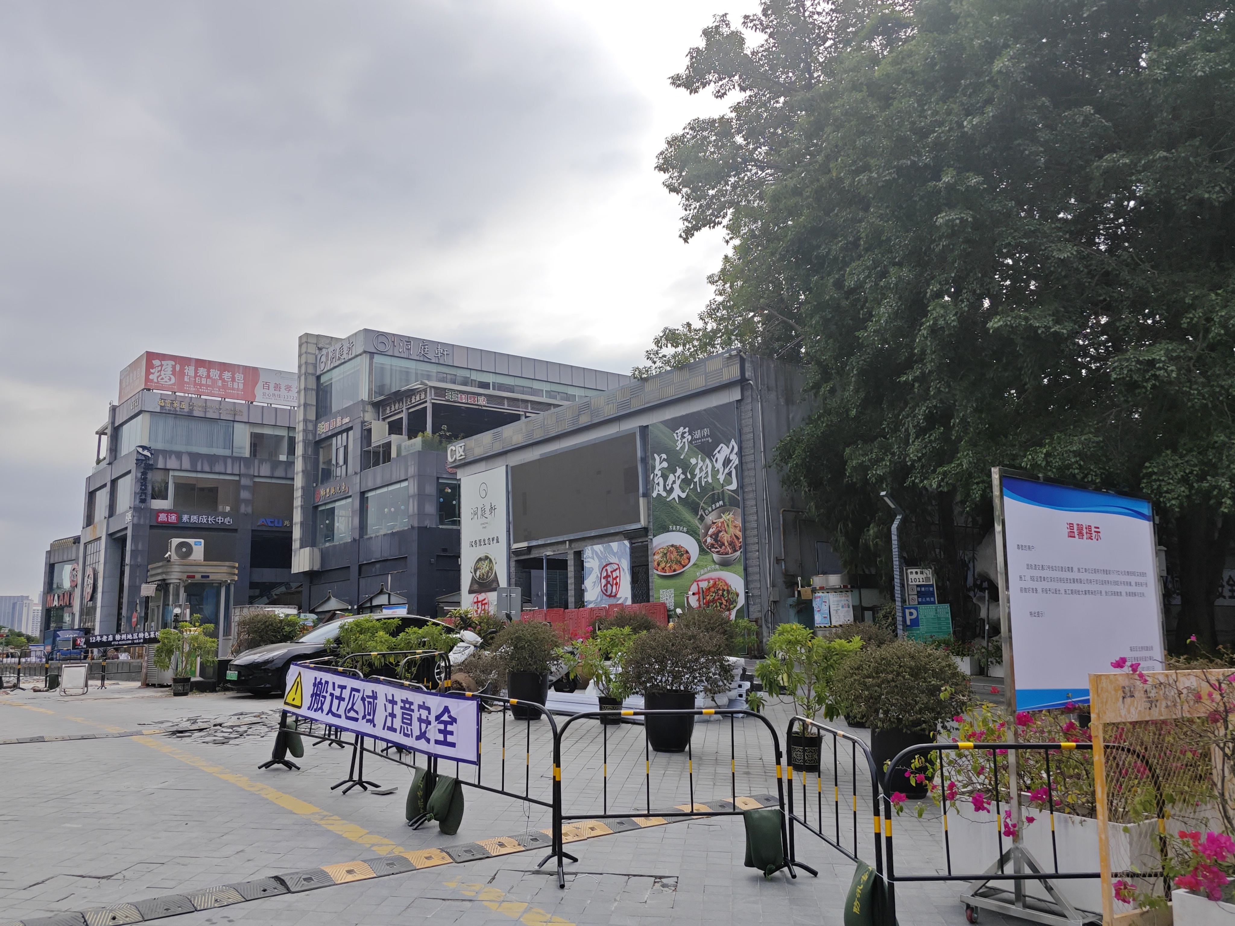 记者在现场看到,拆迁工作有序进行中,建筑外围立起一片片围挡,工人在紧张作业,一些商家在做搬迁收尾工作。车辆入口处有工作人员值守,外部车辆无法进入,旁边张贴着温馨提示:“为配合轨道交通22号线一期工程建设,施工单位对香蜜湖1979文化风情街B区实施围挡施工。”