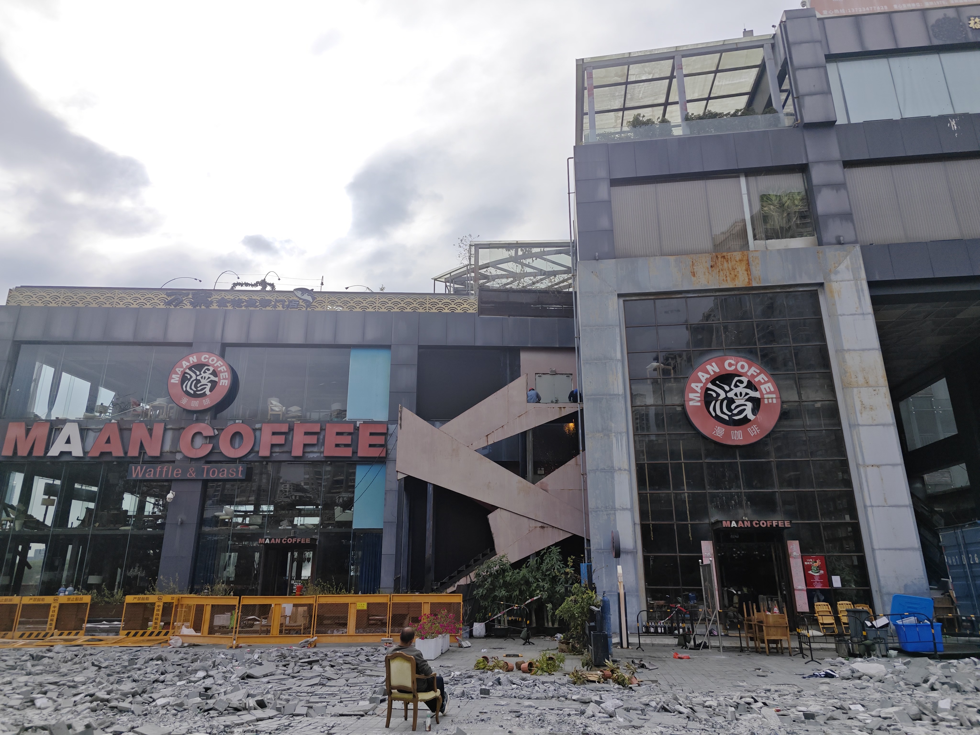 放眼望去,深圳老牌网红咖啡店“漫咖啡”的招牌依然醒目。走近细看,工人正在对咖啡店外部的楼梯进行切割,店门口和旁边停车场的地砖都已打碎,店内仅剩桌椅等家具未搬走。几天前,这家咖啡店最后一天营业,不少深圳人专程跑来拍照留念,再品一杯咖啡跟“漫时光”说再见。