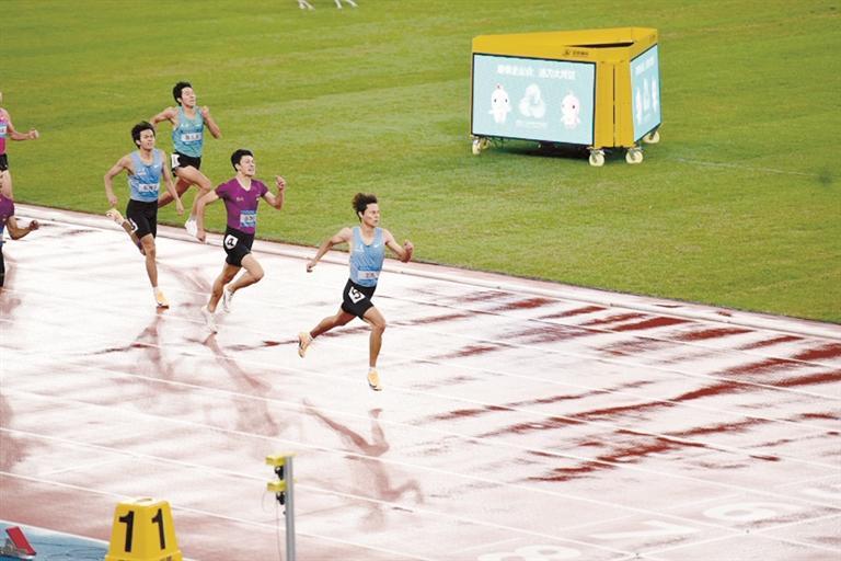 男子400米决赛,选手们在雨中向终点发起冲刺。