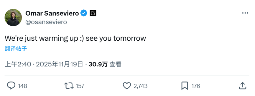 而这还仅仅是开始。随后DeepMind 开发者体验主管Omar Sanseviero发文称,今晚只是“热身”,明天见。