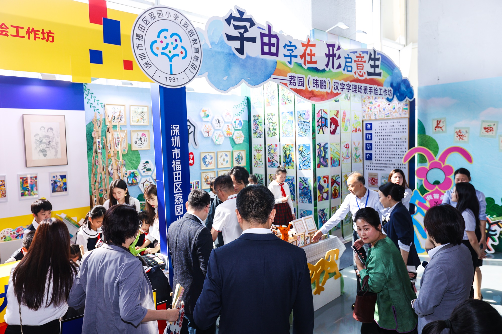 展览现场,多个工作坊凭借独特的教育设计与实践成果成为焦点。荔园小学(玮鹏)“字由字在”汉字字理工作坊前,五年四班的江欣颖正在为观众介绍作品,吸引了众多观众。孩子们围绕汉字展开艺术创作,将甲骨文、节气文化与美术课堂深度融合,通过手绘二十四节气装饰画、甲骨文成语书法、剪纸故事等作品,以童心解构汉字构形智慧,让古老的文字在色彩与线条中焕发新生。