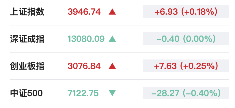 截至收盘,沪指微涨0.18%,报3946.74点;深成指平盘报收于13080.09点;创业板指涨0.25%,报3076.85点;科创50指数则下跌0.97%。