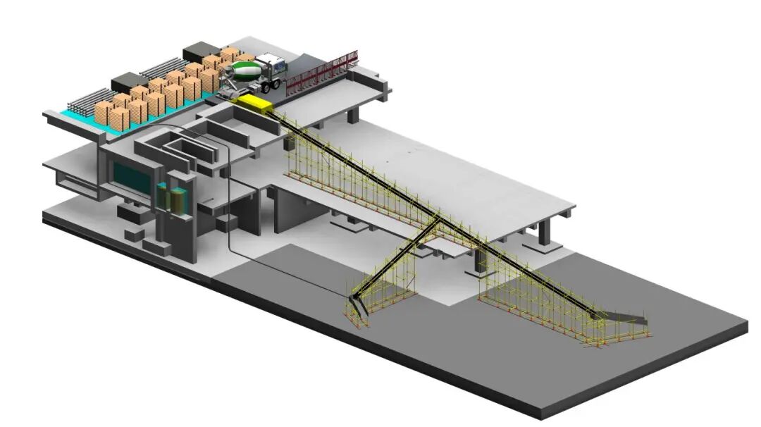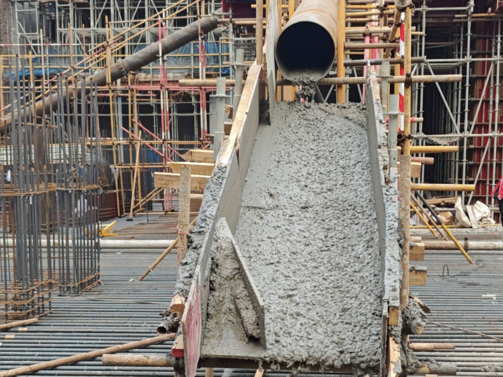 由于浇筑点距离基坑周边较远,汽车泵臂架长度不足,而采用固定泵又易引发管道堵塞、混凝土成分分离等问题,影响施工质量。此外,现场罐车排队密集,易导致道路拥堵,保证混凝土浇筑的连续进行是本次浇筑的关键所在。面对这一挑战,项目团队创新采用以溜管为主、地泵辅助收面的浇筑方案。该方案有效规避了传统泵管易堵塞的弊端,施工效率显著提升——每10立方米混凝土从出料到完成浇筑仅需3分钟,较传统方式节省90%以上时间。