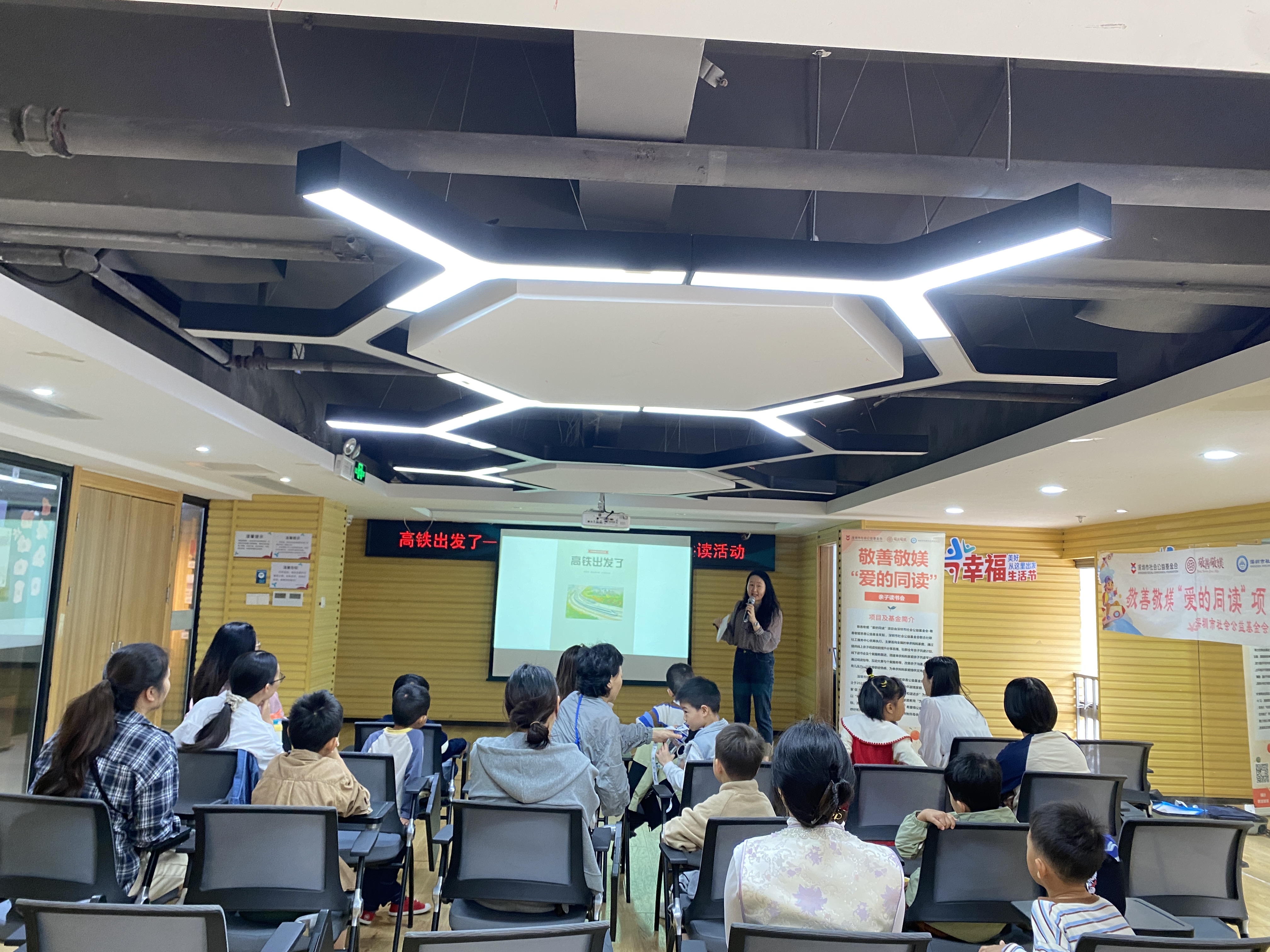 活动聚焦小朋友感兴趣的高铁主题,以“绘本精讲+科学探究+育儿指导”的多元体验,为亲子家庭带来沉浸式科普盛宴。活动现场,资深绘本老师将高铁主题绘本内容精心呈现在PPT中,通过图文并茂的直观展示、生动形象的讲述搭配逼真音效,带领孩子们沉浸式走进高铁的“科学殿堂”。从列车头的流线型设计原理、车厢的密闭性构造,到高铁轨道的铺设技巧,一个个抽象难懂的科学知识点,在绘本故事与实物图片的巧妙结合下变得直观易懂。孩子们听得津津有味,不时举手提问,家长则陪伴在侧,与孩子一起讨论答案,亲子间的温馨互动让科普时光更具温度。