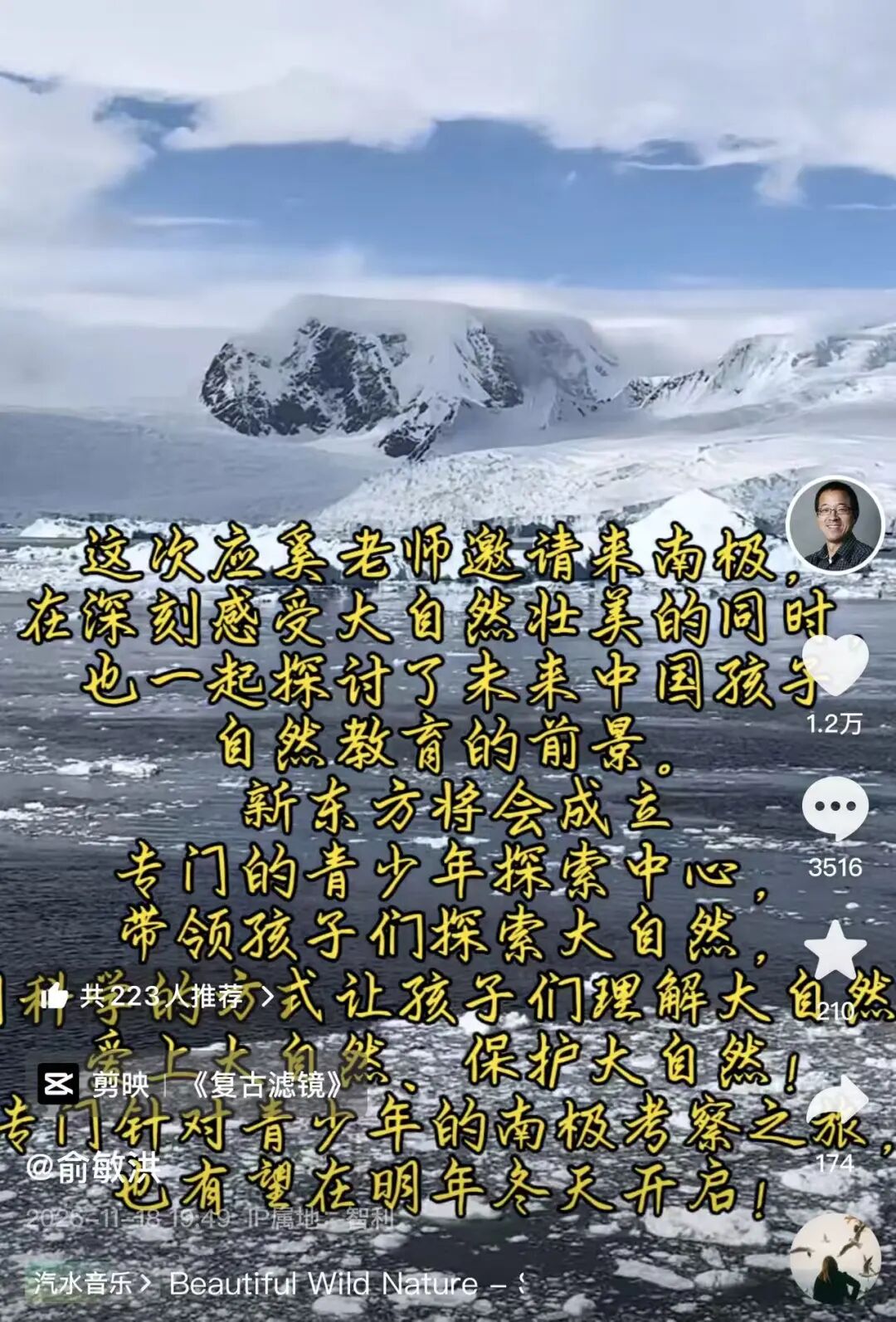 今日(19日)上午,俞敏洪又在抖音账号先后发布了一条“南极游”风景视频,以及一条内文为“奚志农老师给国际游客讲述中国野生动物保护故事”的视频。