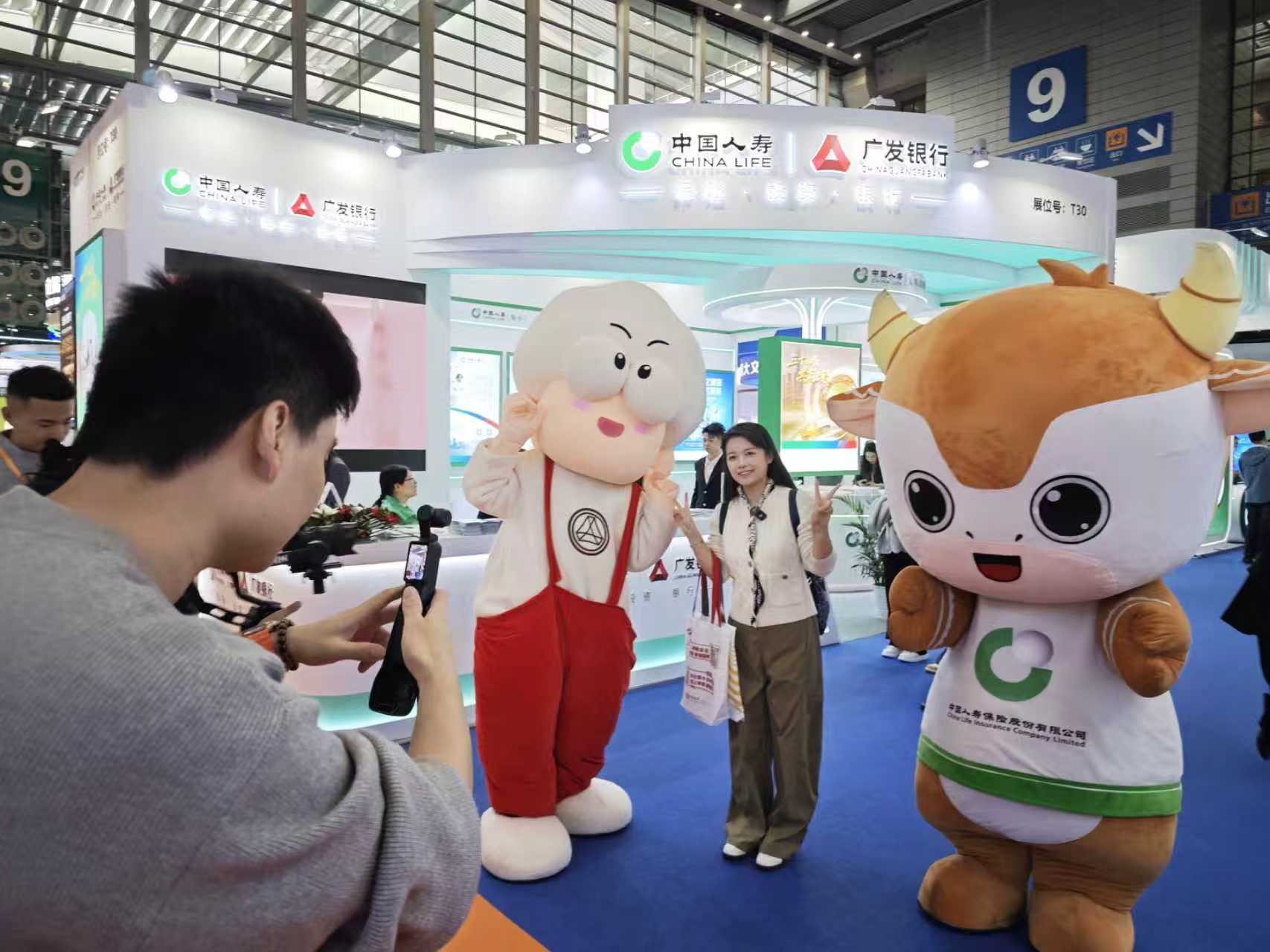 在熙熙攘攘的人潮之中,一只憨萌可爱的“牛犇犇”格外亮眼,许多观展市民都忍不住上前摸一摸。作为中国人寿寿险公司的品牌吉祥物,“牛犇犇”的到来为现场增添了许多欢乐氛围,瞬间拉近了市民与金融服务之间的距离。