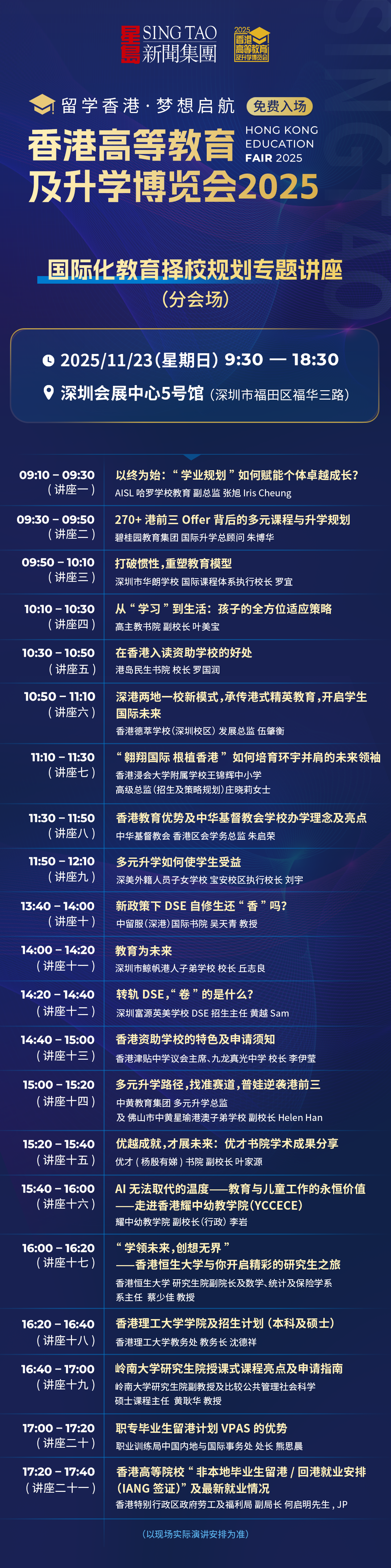 “香港高等教育及升学博览会2025”由香港特区政府教育局、深圳市教育局支持,星岛新闻集团主办。15所香港高校校长将来到现场,与学子面对面畅谈香港高校特色,分享赴港升学一手资讯。