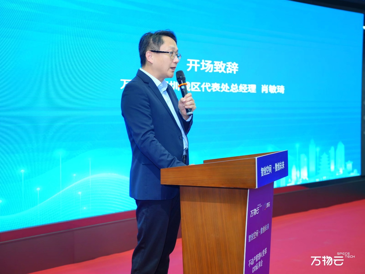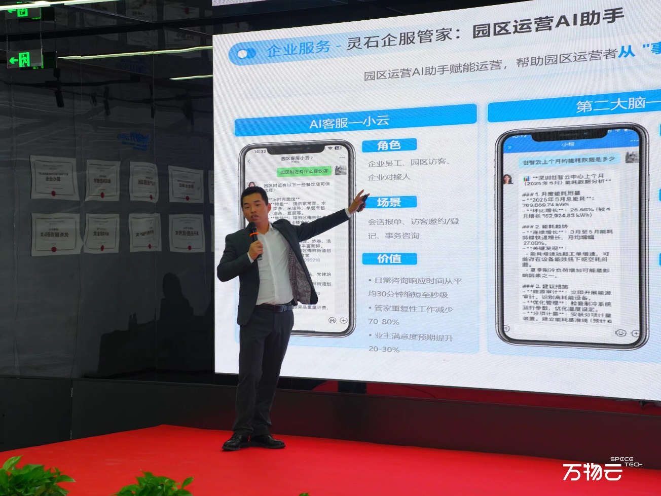 活动现场,万物云深圳代表处总经理肖敏琦在致辞中明确了 “灵石” 的核心定位 —— 不动产管理的 AI 大脑。该系统以开放架构贯通能耗、安防、资管全场景,精准破解行业稳收、节能、招商三大核心痛点。肖敏琦呼吁业界伙伴携手共建智慧园区、绿色低碳、数字孪生生态,在存量时代共同挖掘资产价值。
