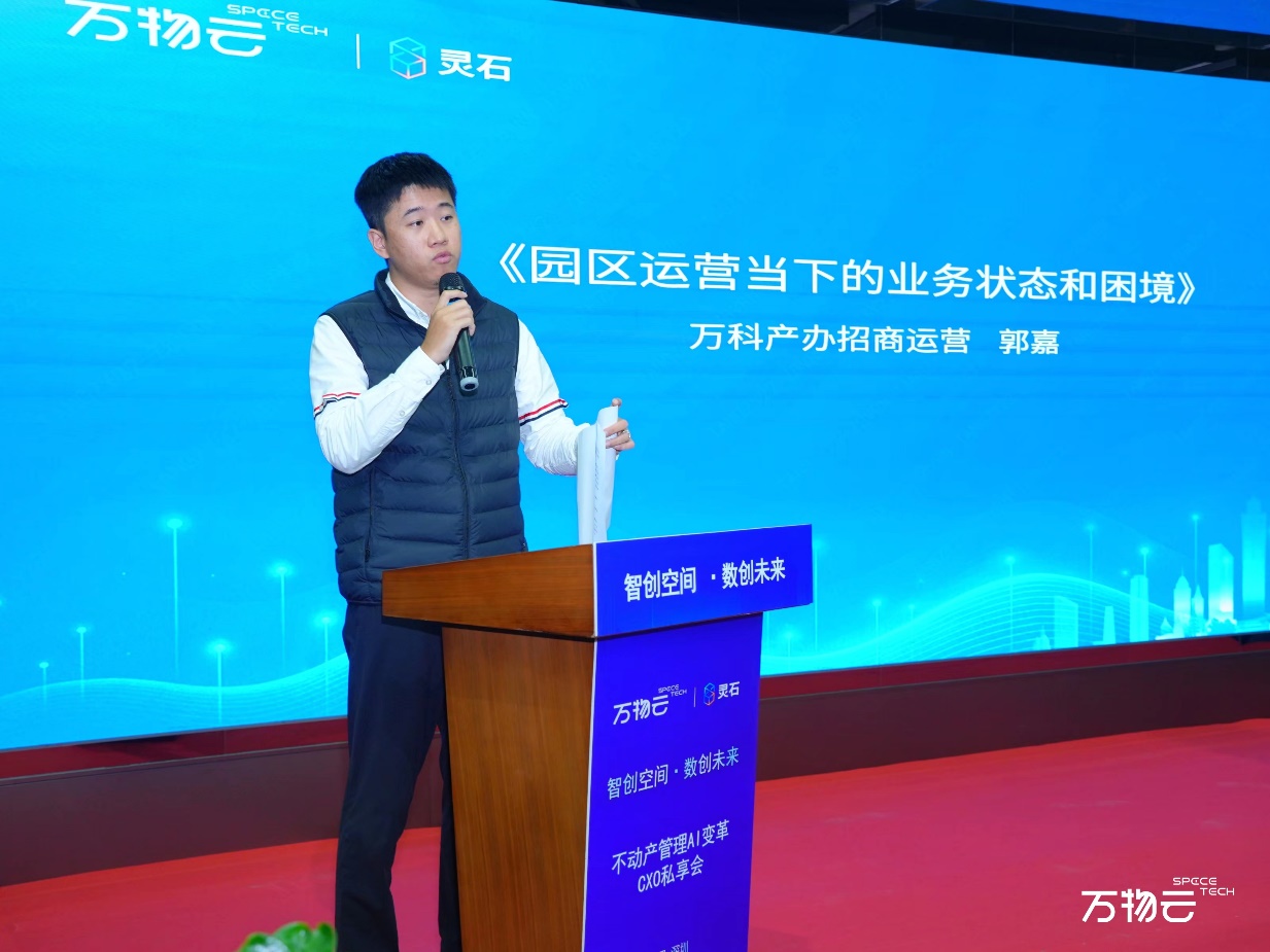 在主题分享环节,万科产业办招商运营负责人郭嘉聚焦《园区运营当下的业务状态和困境》,直指传统园区运营 “看不见、管不住、留不住” 的三大痛点:设备状态监测不及时、人力成本高企、客户向智慧园区流失。他提出破局需实现三大转变:以 IOC 平台实现 “数据驱动” 决策,用物联网技术达成 “降本提效”,借运营数据开展 “价值共创”,从单纯 “管理者” 转型为 “企业合伙人”,呼吁科技伙伴共建 “会思考、能成长、有温度” 的智慧园区生态。
