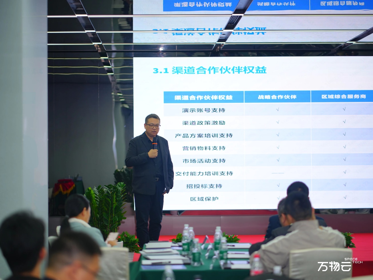 万睿科技渠道总监白彦详细介绍了渠道合作伙伴发展计划,通过演示账号支持、产品培训、市场活动赋能、招投标支持等差异化权益设计,助力合作伙伴提升综合服务能力,共拓空间数字化市场。