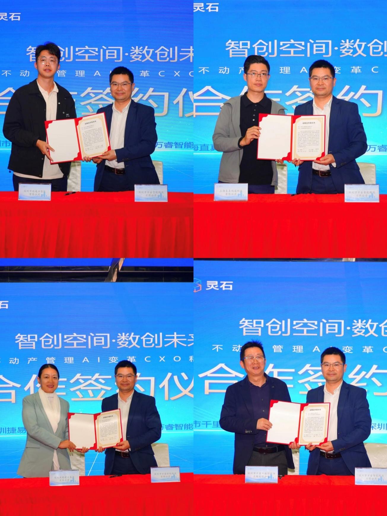 现场还举行了签约仪式,深圳捷易建设集团、深圳市千里马安防软件工程、上海直真视通科技、深圳市瑞迪兴智能等企业与万物云达成合作,将以 “灵石” 产品为基础,推进智慧空间管理的创新实践与落地。