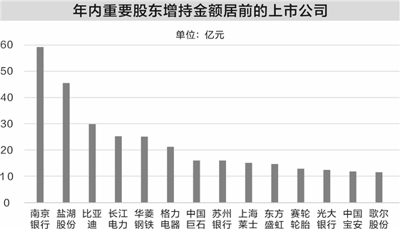 从单家公司看,今年以来增持金额超10亿元的公司有17家,6家公司增持金额超过25亿元,位居榜首的是南京银行,其他还有盐湖股份、比亚迪、长江电力、华菱钢铁等。