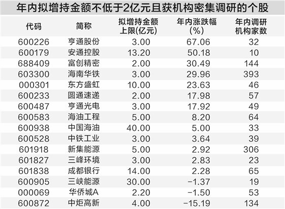 结合机构关注情况来看,截至11月19日,年内获得10家及以上机构调研,且拟增持金额上限不低于2亿元的公司有16家,包括拟增持金额超过10亿元的中国海油、三峡能源、成都银行等。调研机构数超过百家的有新集能源、富创精密、中炬高新等。