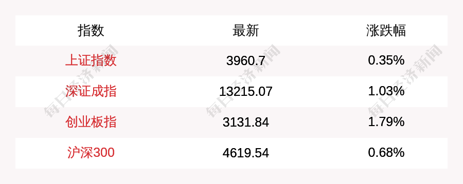 11月20日,A股三大股指集体高开。其中,上证指数开盘上涨13.96点,涨幅为0.35%,报3960.7点;深证成指开盘上涨134.98点,涨幅为1.03%,报13215.07点;创业板指开盘上涨54.99点,涨幅为1.79%,报3131.84点;沪深300开盘上涨31.25点,涨幅为0.68%,报4619.54点。