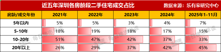 记者从乐有家研究中心获悉,该中心数据监测发现,从近五年不同房龄段的房源成交占比数据来看,房龄在5年以内的次新房及房龄在20年以上的老旧小区成交占比持续提升。
