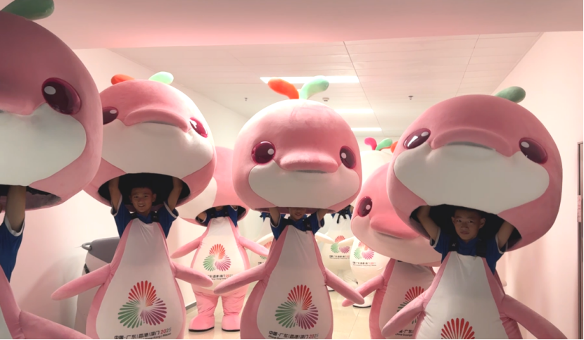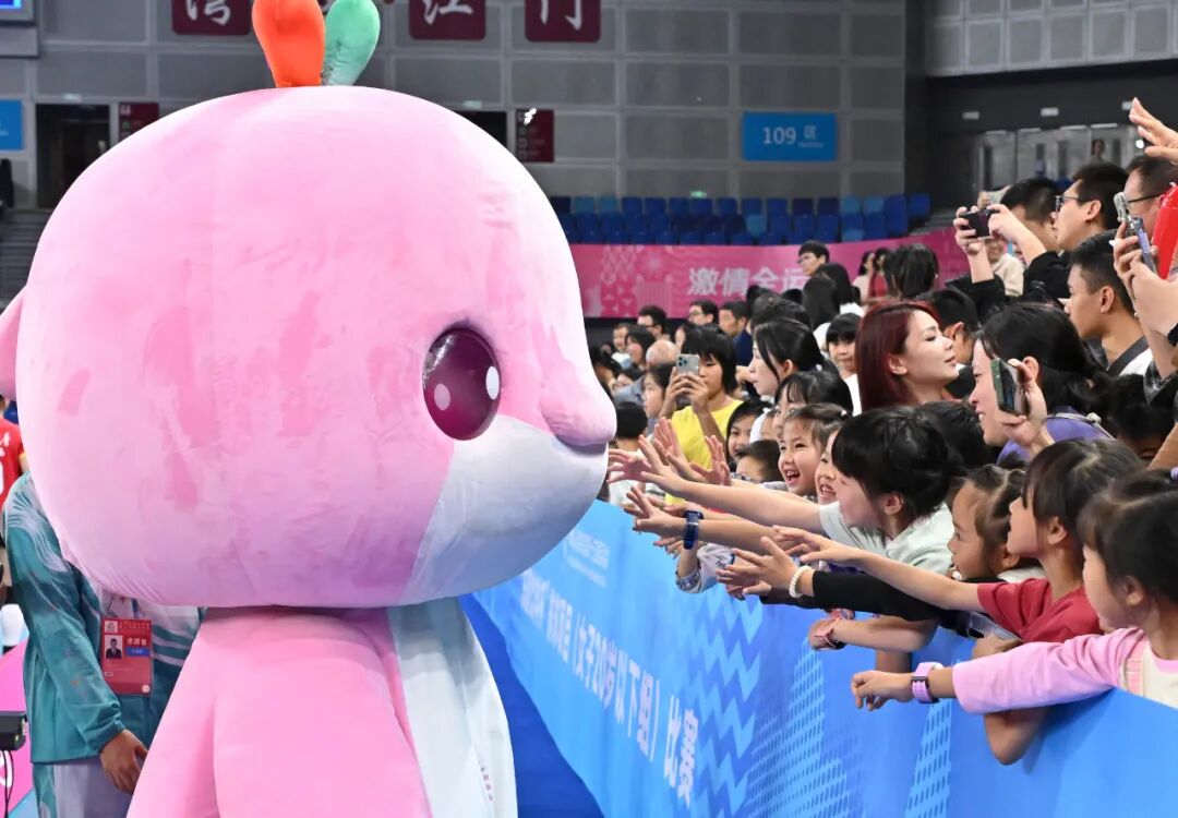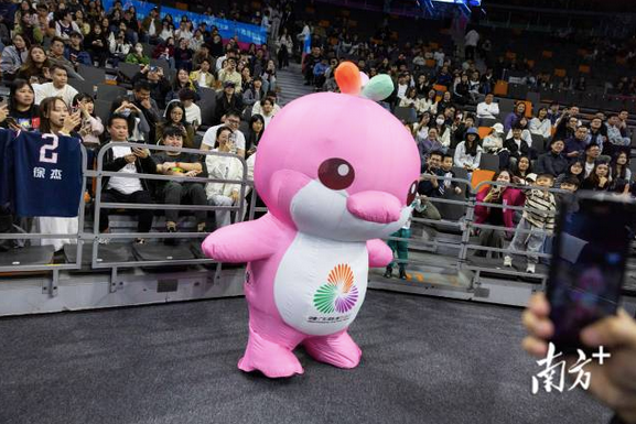 吉祥物“乐融融”在比赛间隙与观众互动。图片来源:十五运会广东赛区执委会