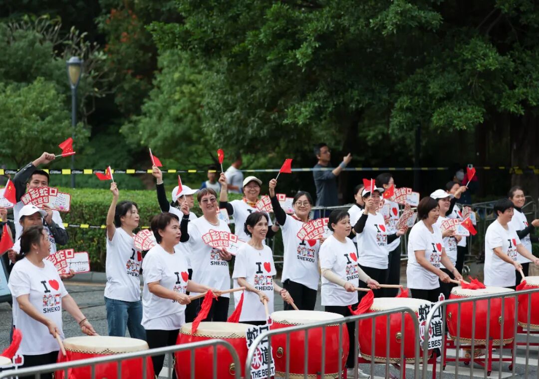 深圳市民在路旁为参赛选手击鼓加油。图片来源:十五运会广东赛区执委会