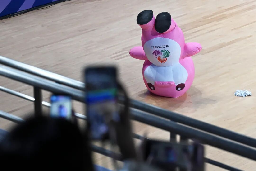 吉祥物“乐融融”在场边表演倒立和观众互动。图片来源:十五运会广东赛区执委会