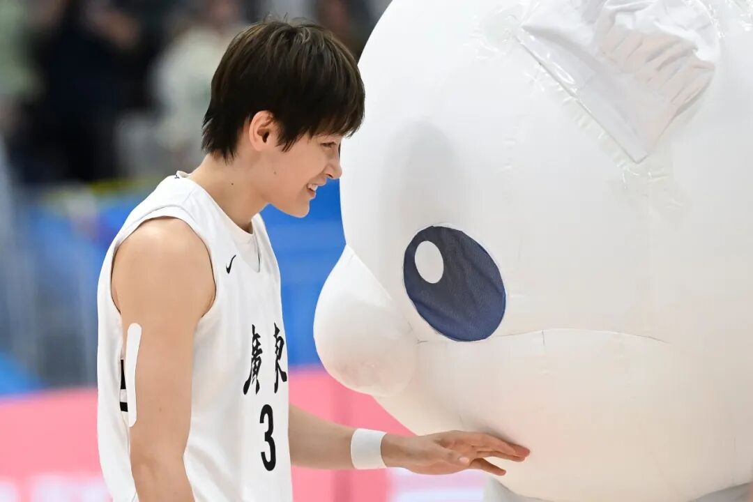 广东队球员杨力维在中场休息时与吉祥物“喜洋洋”互动。图片来源:十五运会广东赛区执委会