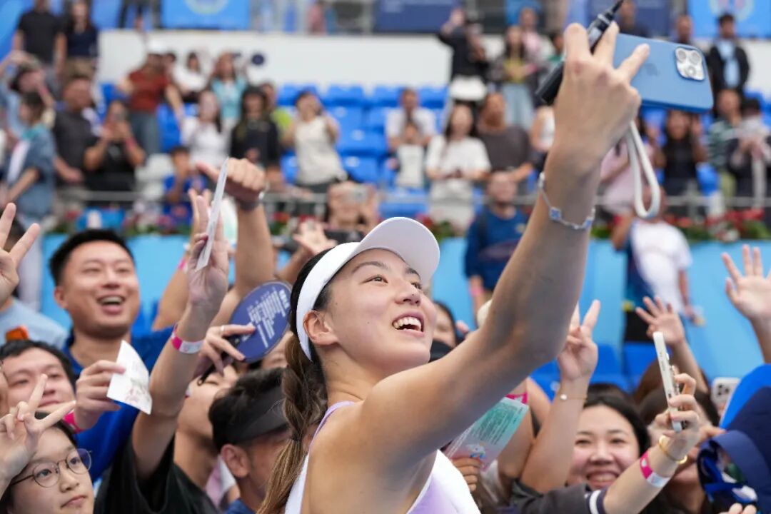 广东队选手王欣瑜在比赛结束后与观众合影。图片来源:十五运会广东赛区执委会